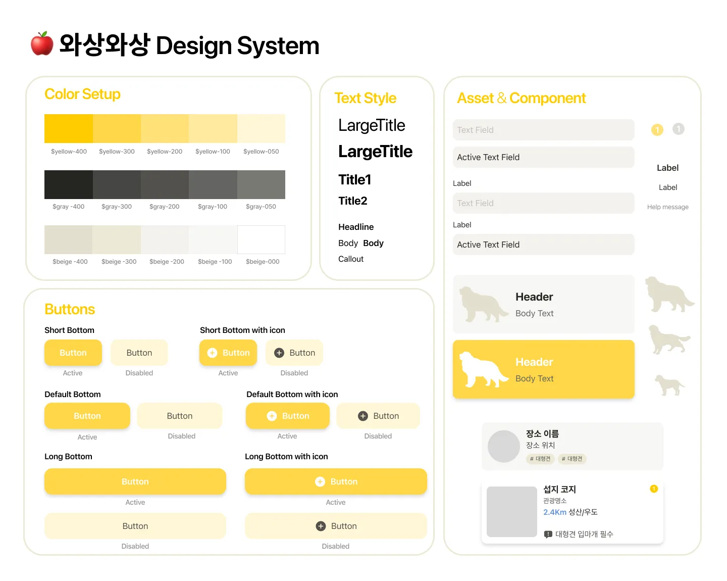 메인 컬러와 서브 컬러를 먼저 설정한 후 필요한 요소 및 컴포넌트를 만들면서 규칙을 생성했어요. 화면에는 나와있지 않지만, 컴포넌트 간의 간격과, 폰트를 쓰는 규칙 또한 시스템화하여 전체적으로 통일되게 작업했어요.