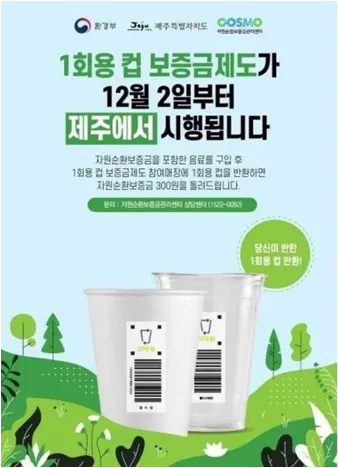 1회용 컵에 일정 금액의 자원순환보증금 300원을 부과하고, 소비자가 사용한 컵을 반납하면 보증금을 그대로 돌려주는 제도