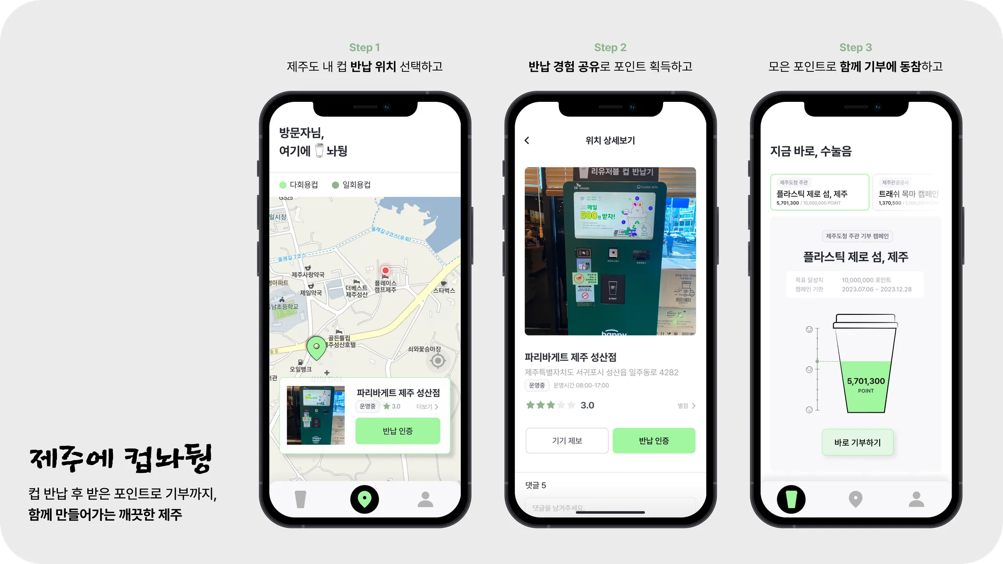 일회용 / 다회용 컵 반납처의 정보를 공유하고, 적립한 포인트를 기부하는 자원 순환 참여 플랫폼