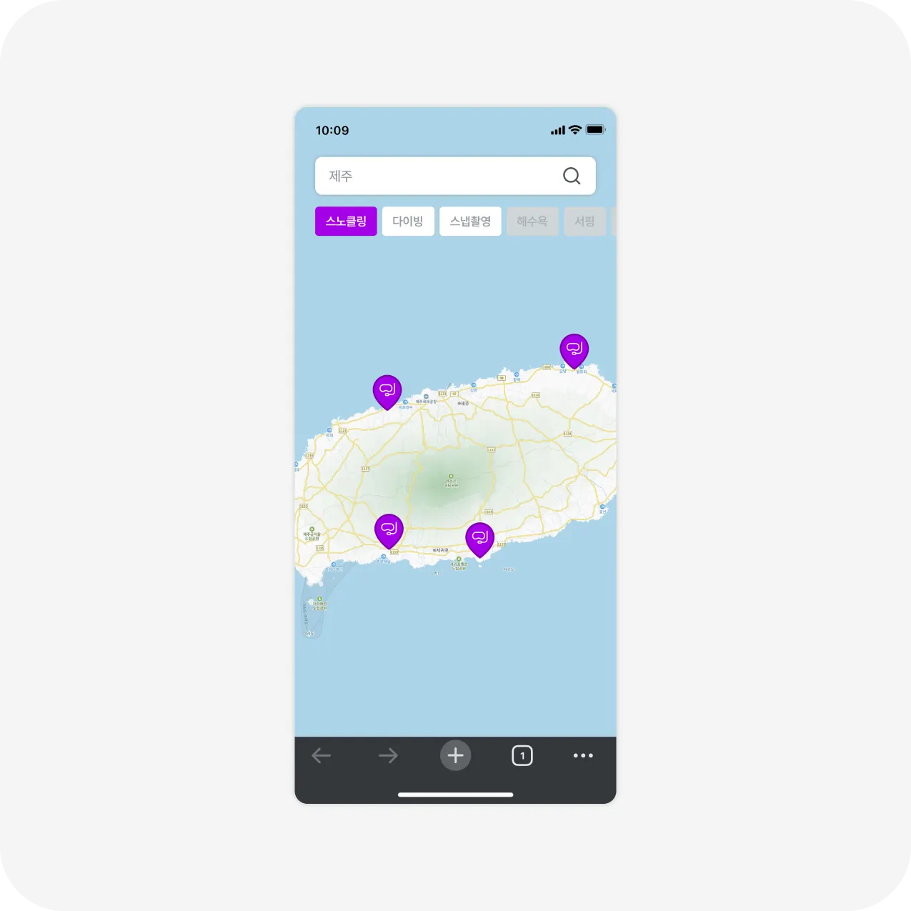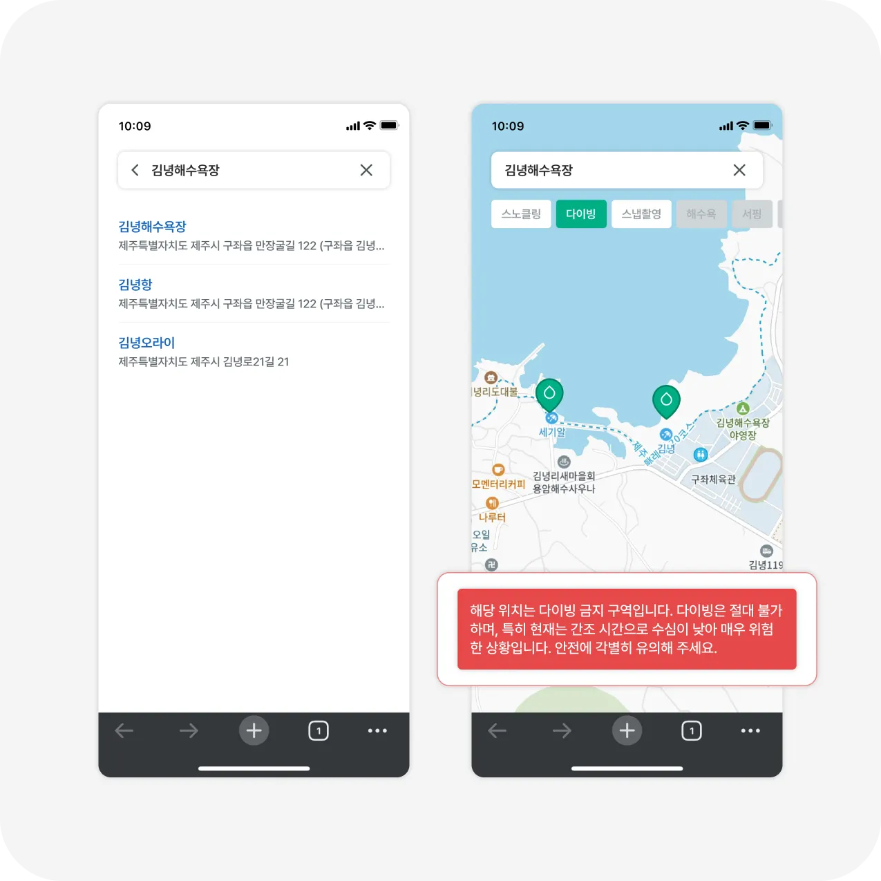 현재 사용자 위치 주변 또는 제주도 내 최적의 바다를 지도에서 바로 확인할 수 있습니다.