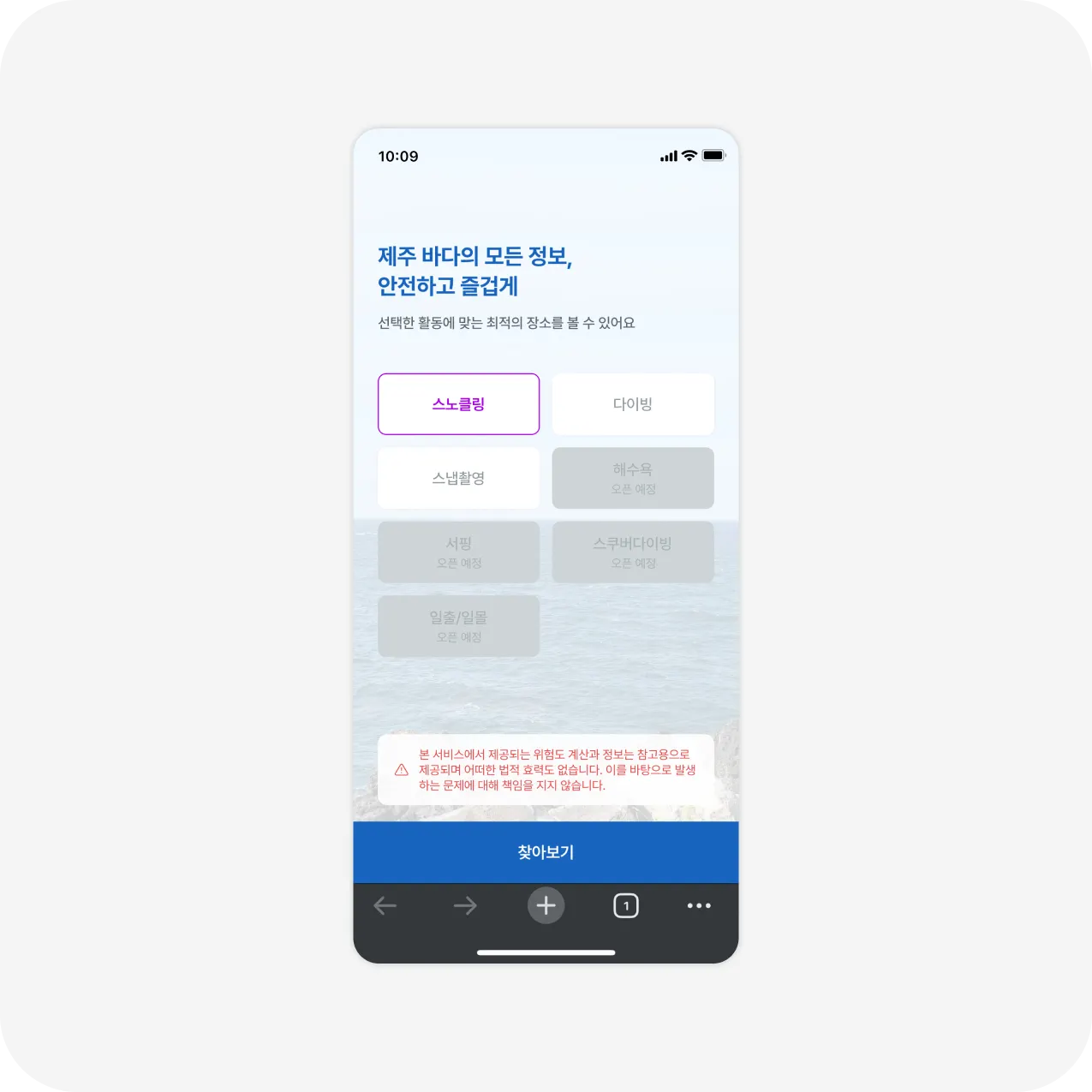 바다 활동에 따라 최적의 장소와 위험도를 안내하여 제주 바다를 안전하게 즐길 수 있도록 돕습니다.