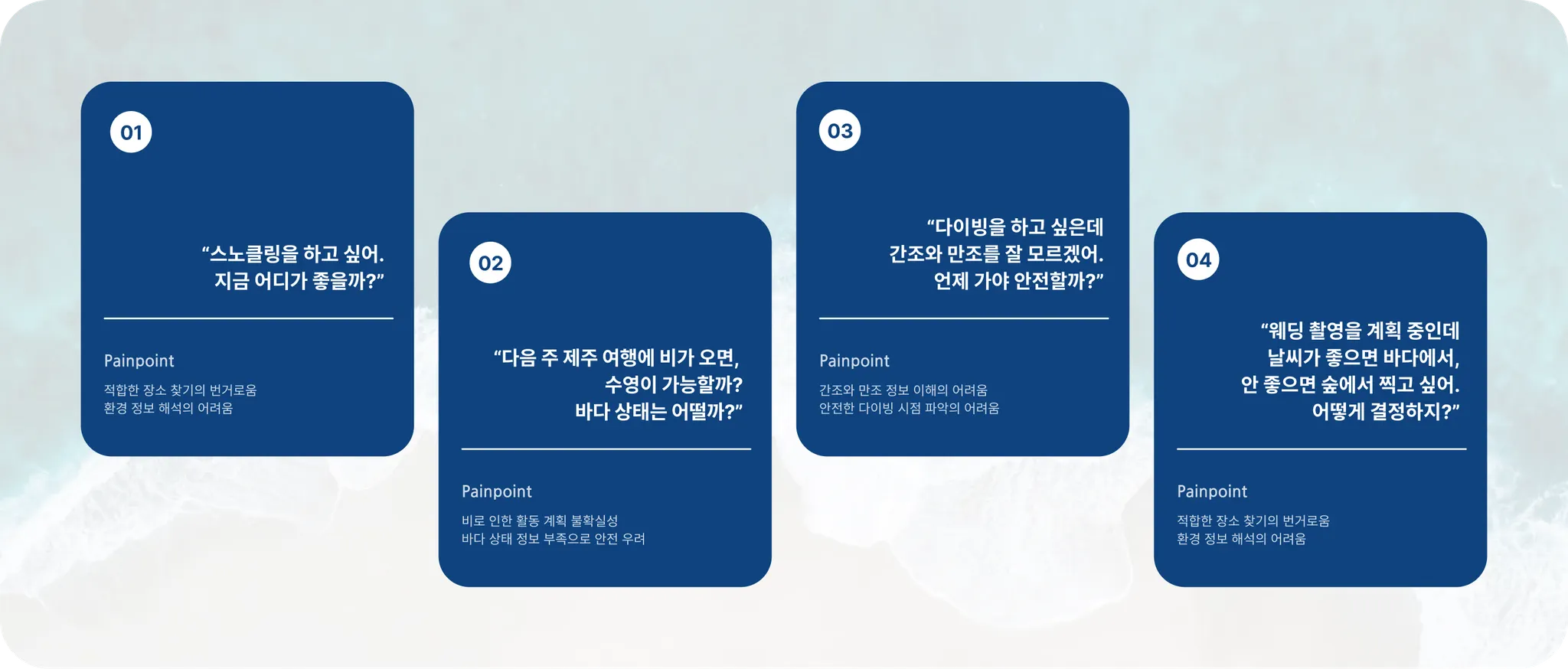 바다 이용객들은 여행 준비 중에 실시간 바다 정보와 해양 상태를 확인하기 어려워 불편함을 겪습니다. 서핑, 다이빙, 스노클링 등 각 활동에 필요한 정보(파고, 물때, 수온 등)를 개별적으로 찾거나 예측하기 어려워 현재 상태를 모르는 채 바다를 방문해야 합니다. 여행 당일 날씨나 조류가 갑자기 변할 때 준비하기도 힘들어 계획에 차질이 생기고, 이는 여행의 질을 떨어뜨릴 수 있습니다.