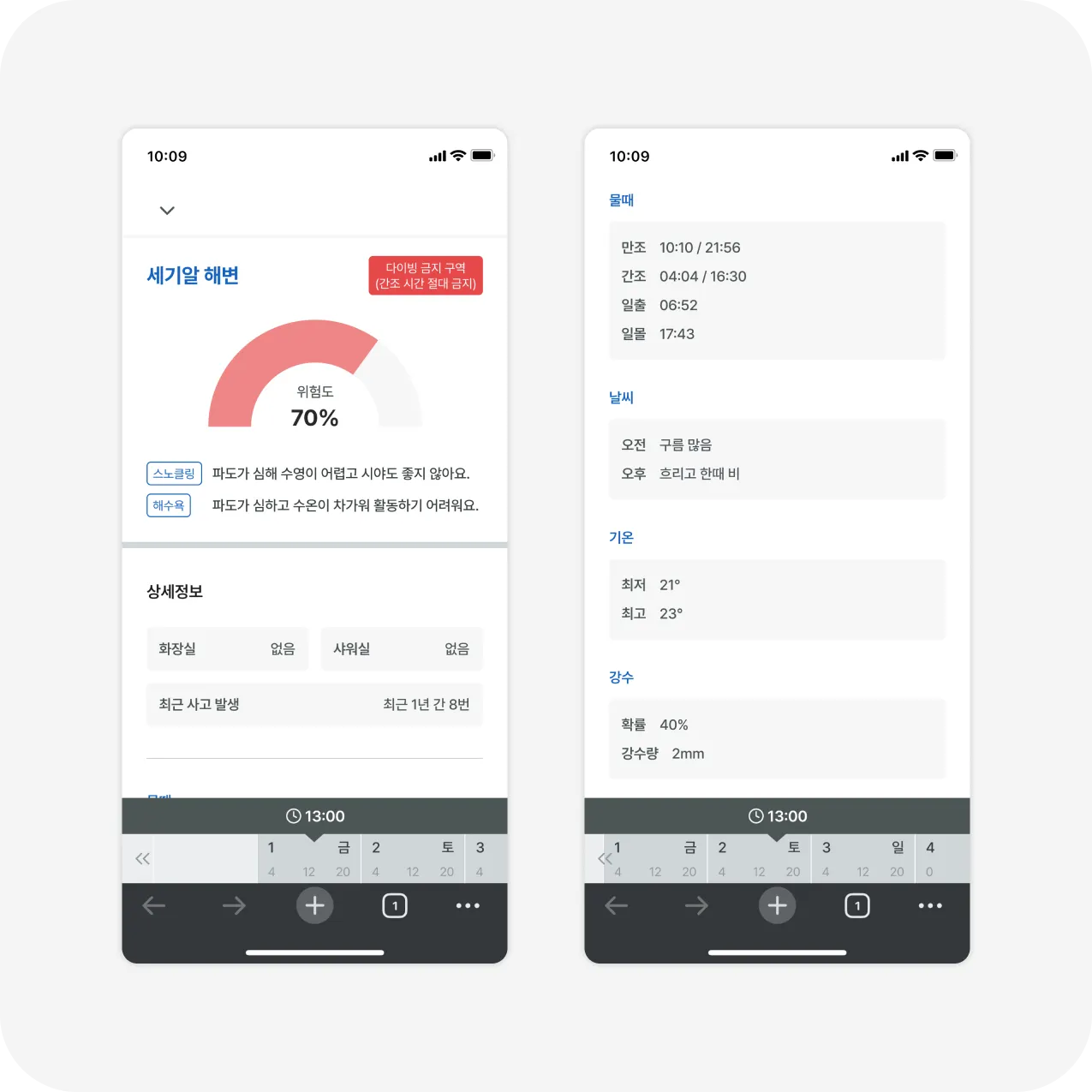 상세 페이지를 통해 더 자세한 해양 환경 정보, 위험 요소, 주의보 및 안전 정보를 파악할 수 있습니다.