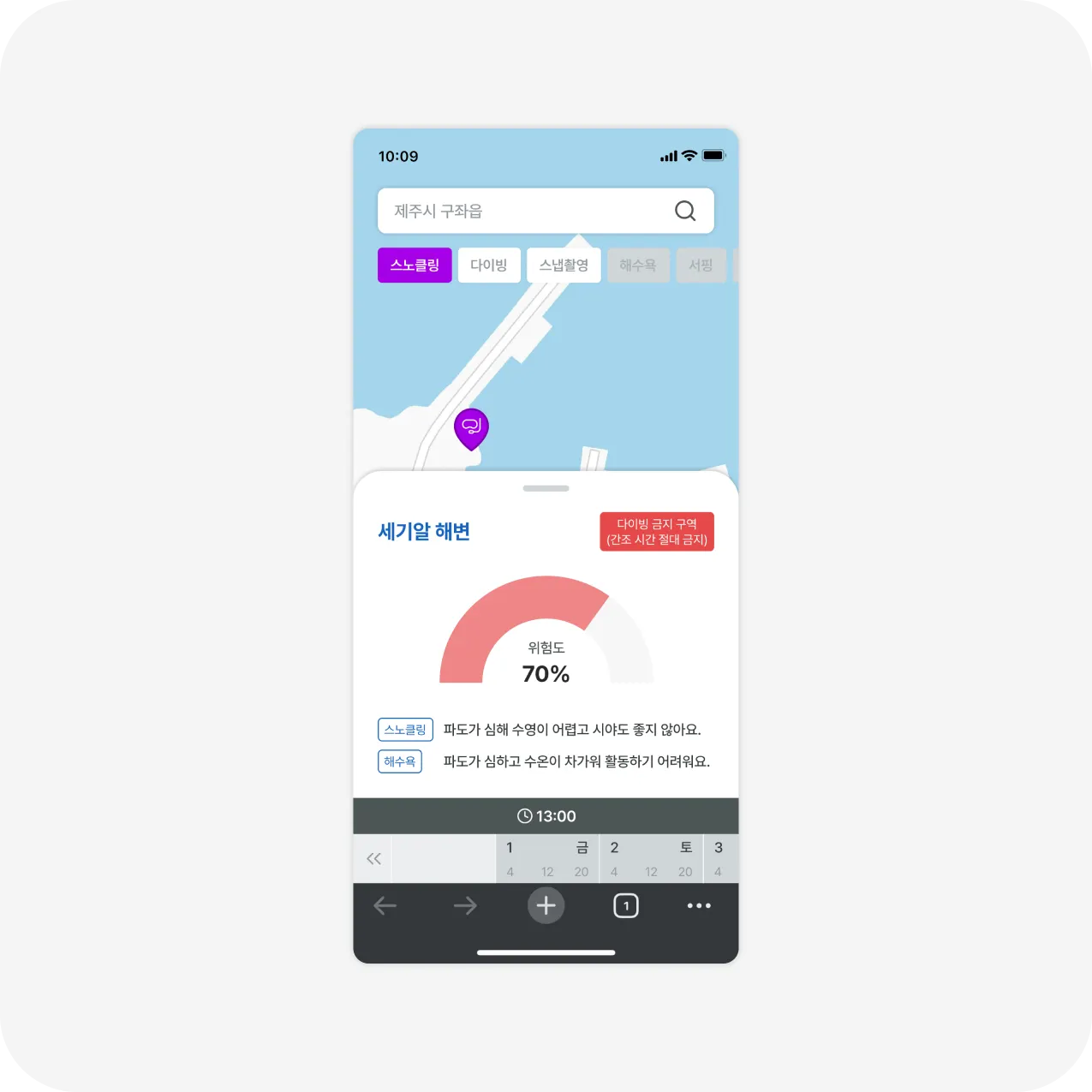 선택한 바다의 최적 액티비티와 바다 상황, 위험도를 한눈에 쉽게 확인할 수 있습니다.