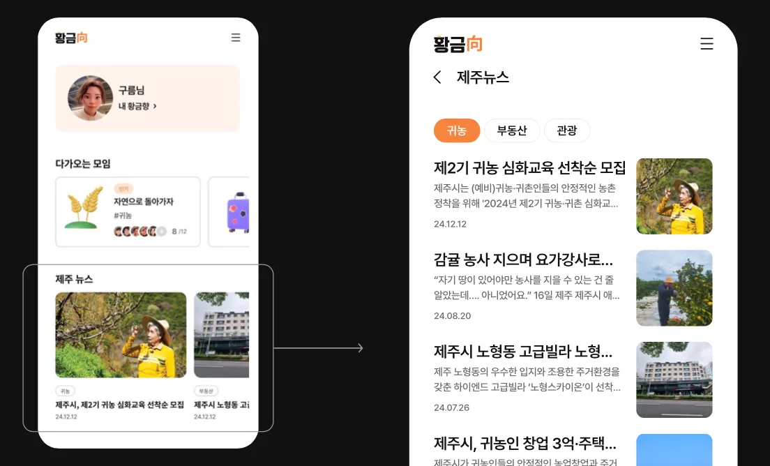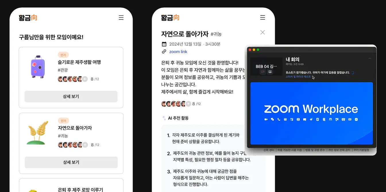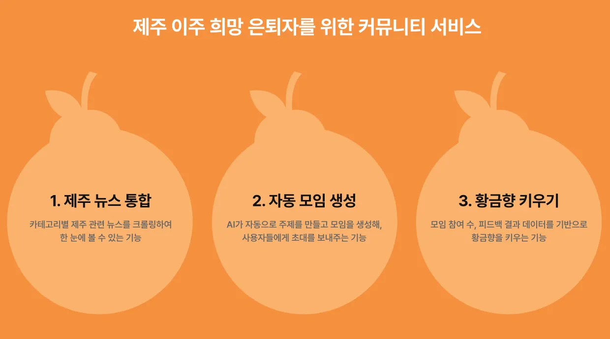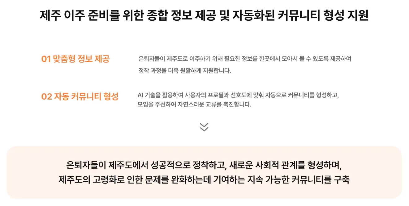 제주에서 황금기를 향해 가는 방향이라는 합성어로 인생의 2막, 제주도로의 은퇴 이주를 꿈꾸는 분들을 위한 AI 기반 커뮤니티 서비스입니다. 단순히 정보를 제공하는 것을 넘어, 이주 준비 과정에서의 막막함을 해소하고 비슷한 관심사를 가진 사람들과의 연결을 돕습니다.