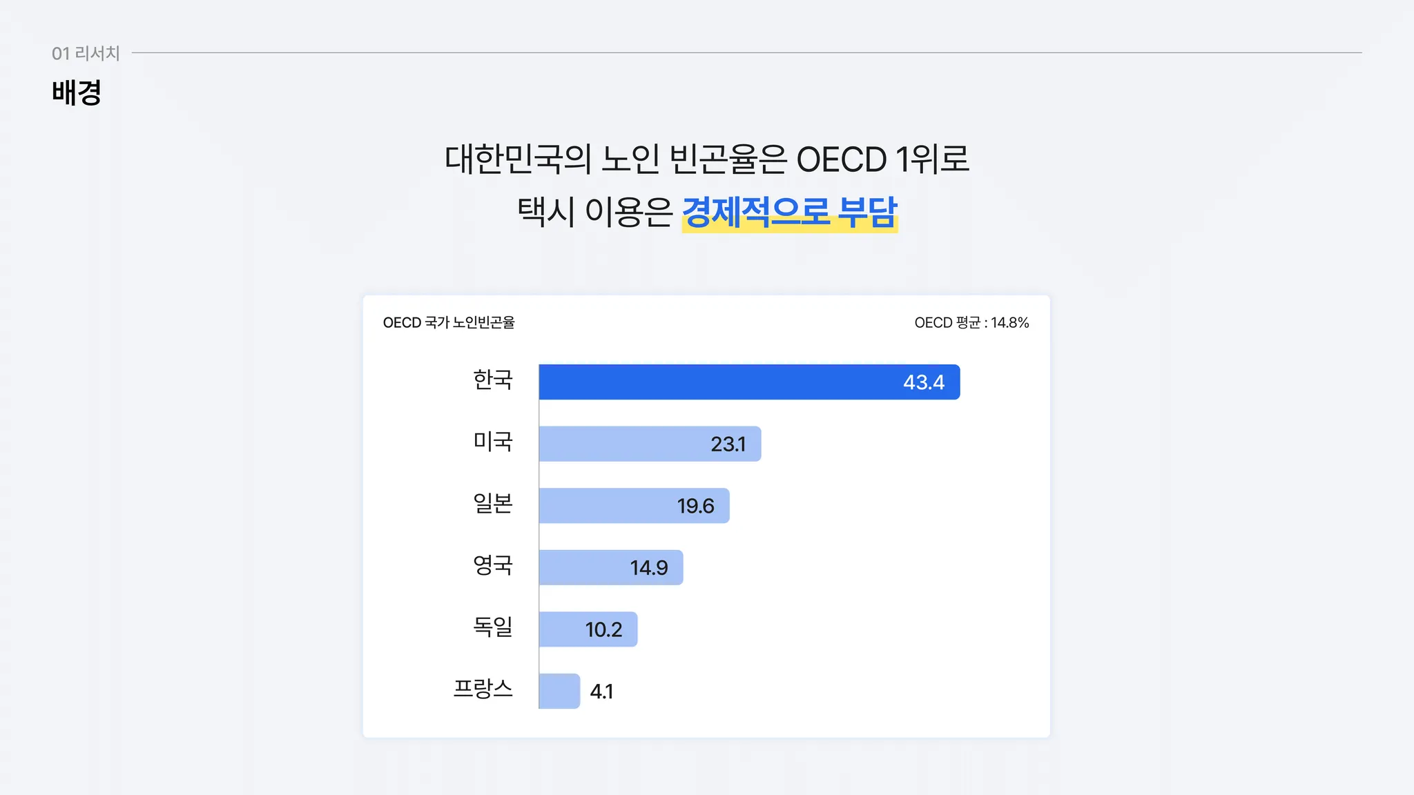 대한민국 노인 빈곤율 OECD 1위 (43.4%)로 택시 이용 부담 가중.