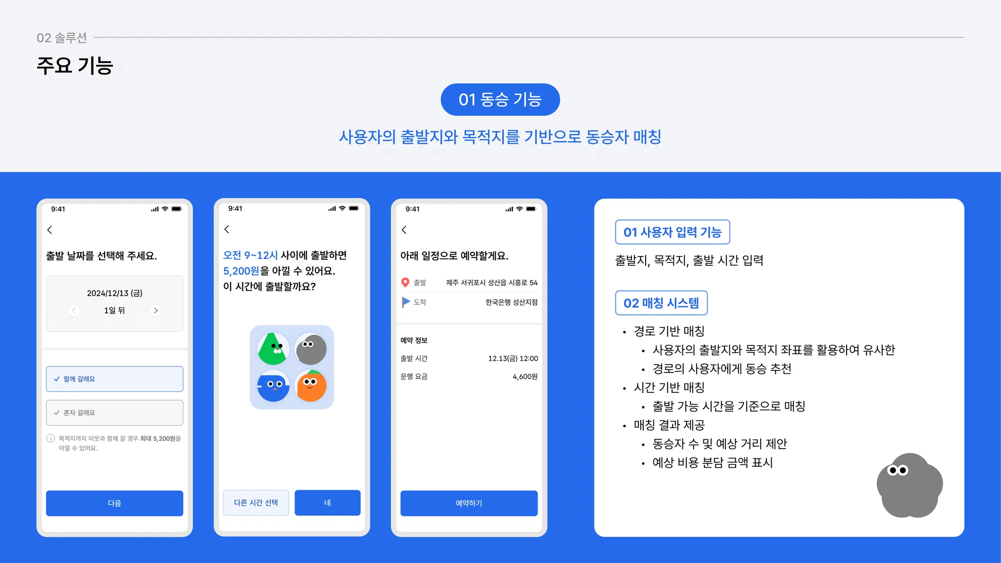출발지와 목적지 기반 매칭으로 동승자 찾기.