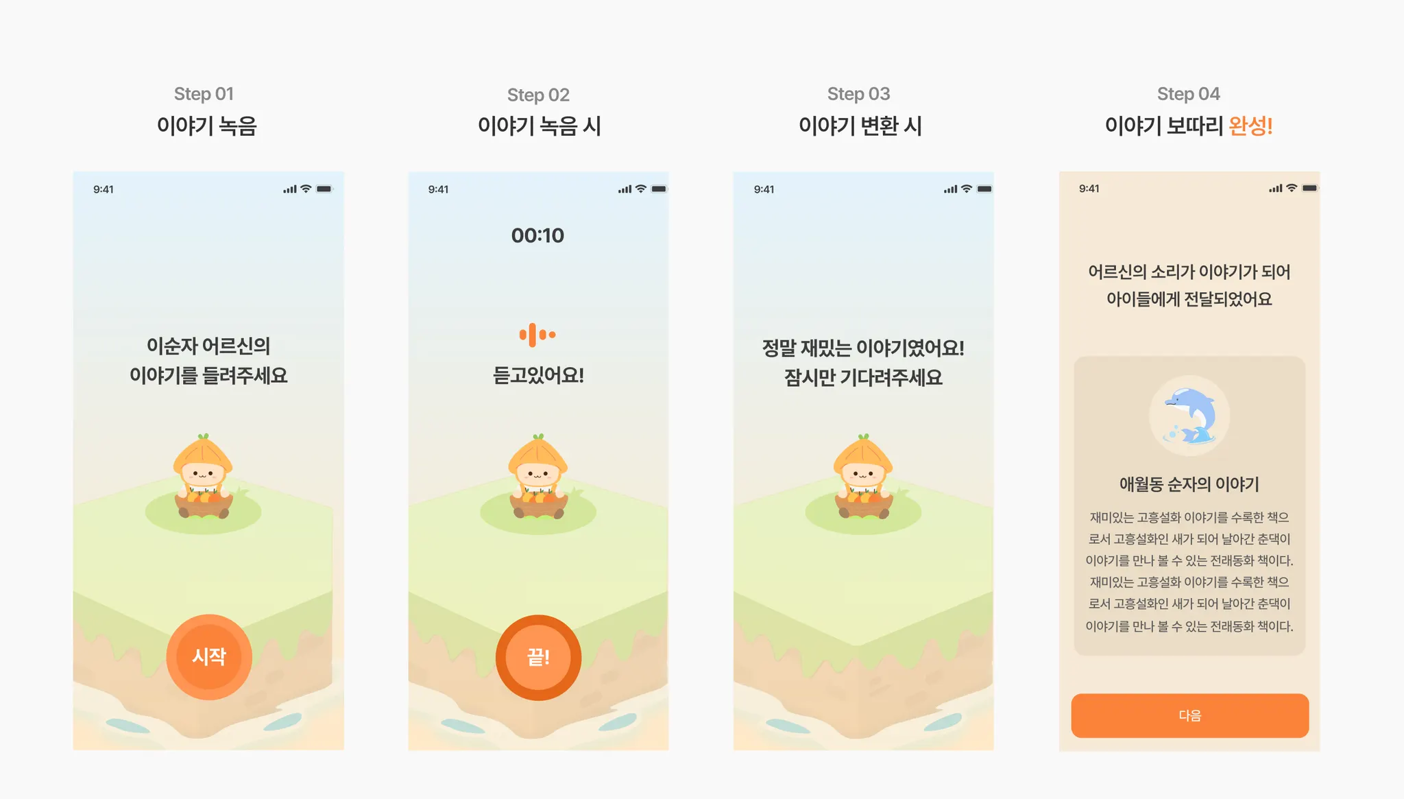 어르신께서 주제에 맞는 이야기를 담아주시면, 어르신이 주인공이 되는 재미있는 동화로 변환되어 아이들에게 전달해요.