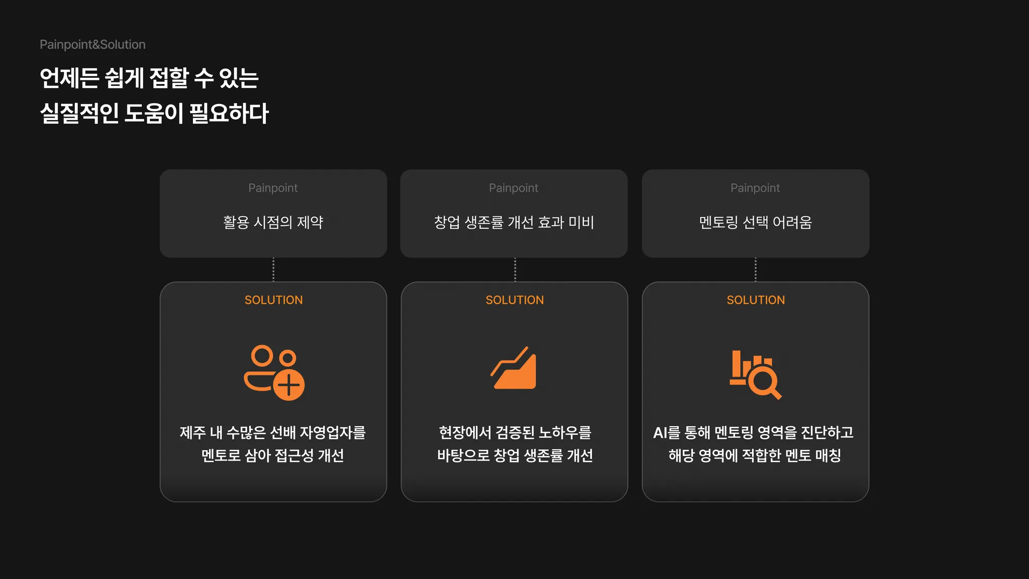 1년 365일 매일매일 위기를 겪고 있는 청년 사장님을 위해, 이벤트성 지원이 아닌 동행할 수 있는 멘토링을 제안합니다.