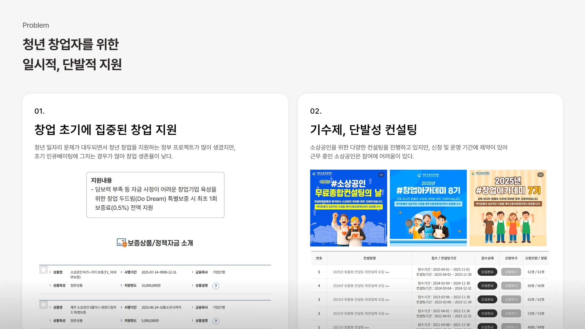 하지만, 자금 지원은 일회성으로 컨설팅은 기수제, 원데이로 운영되는 등 단발적인 지원에 그친다는 아쉬움이 있습니다.