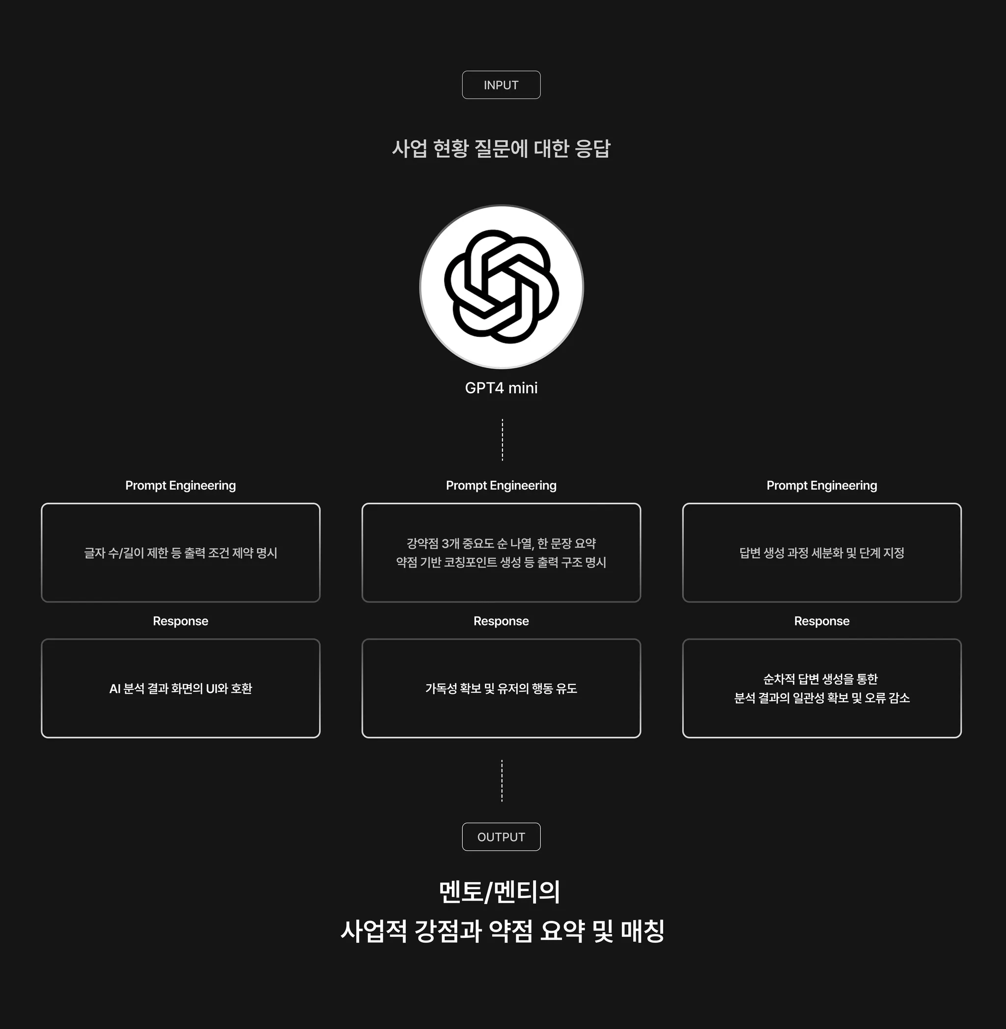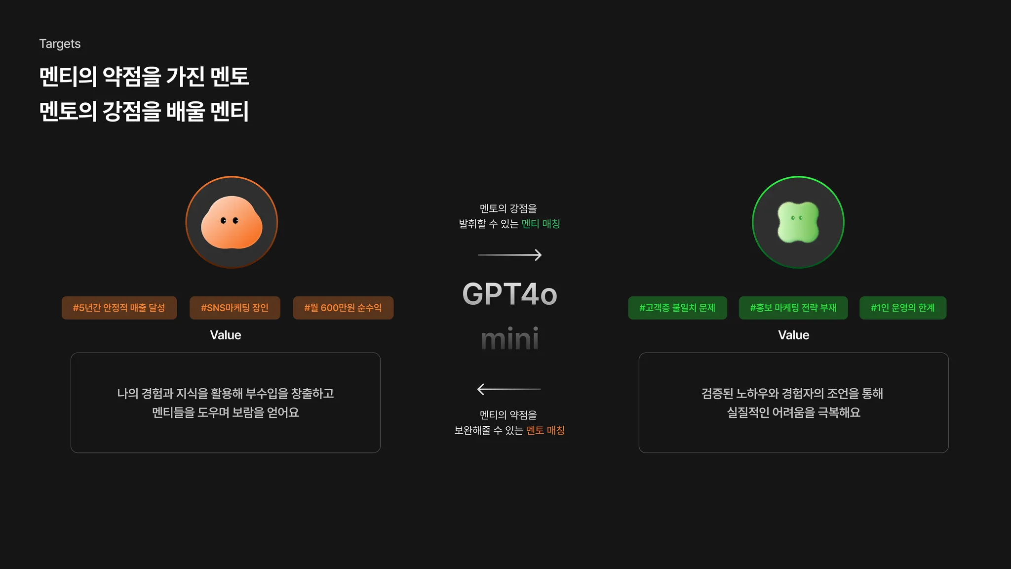AI가 선배 사장님(멘토)의 강점과 청년 사장님(멘티)의 약점을 진단하고, 진단 결과를 바탕으로 멘티의 약점을 보완해줄 수 있는 멘토를 매칭합니다.