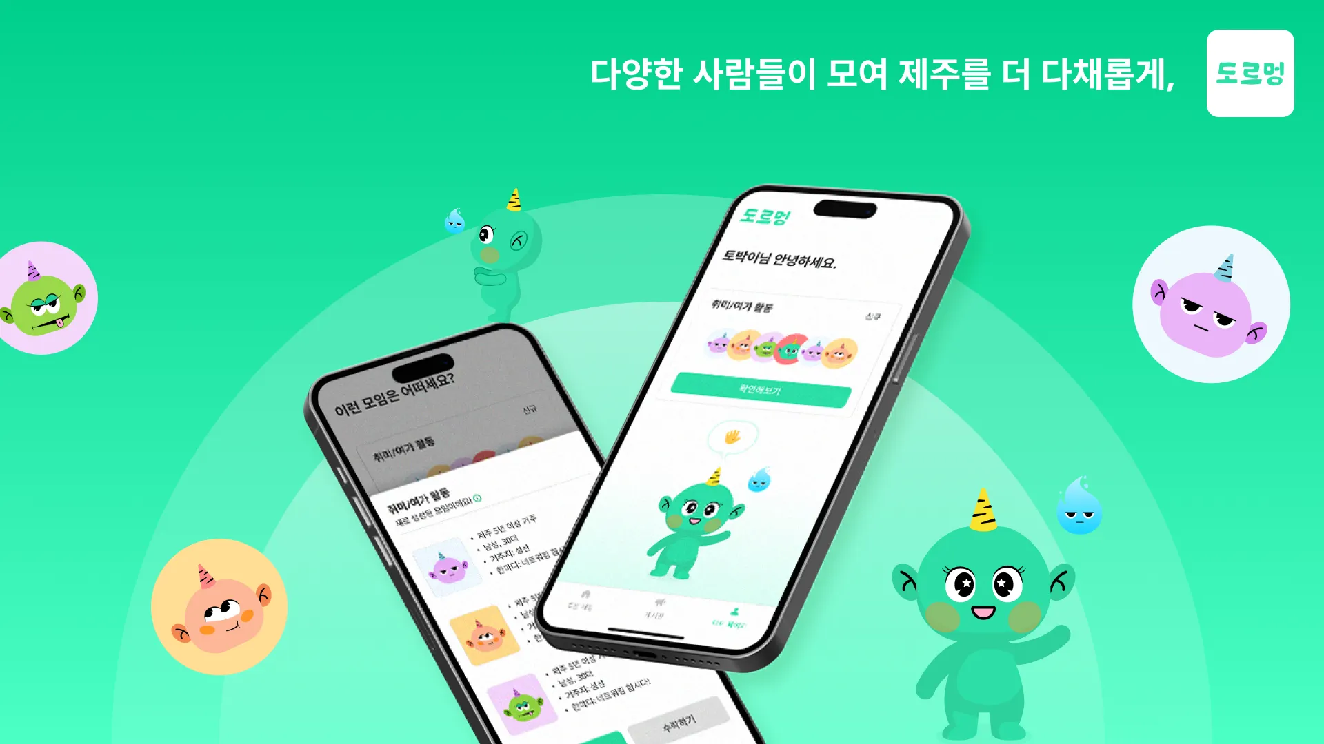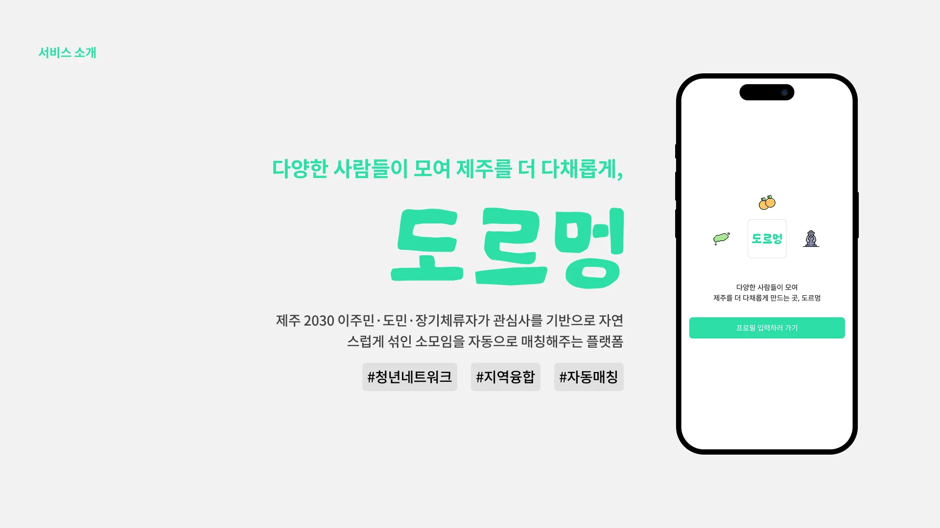 서비스명: 도르멍은 ‘길동무’라는 제주 방언에서 착안한 이름으로, 새로운 사람들을 자연스럽게 이어주는 서비스 정체성을 담았습니다.