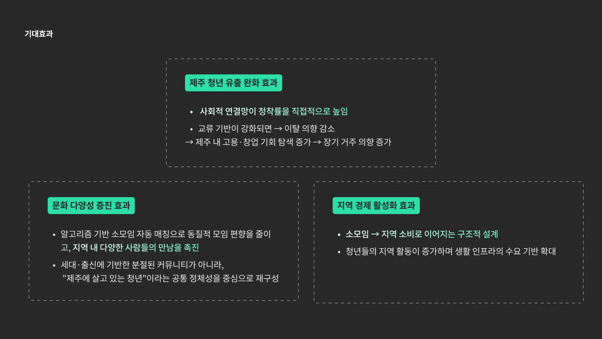 1. 제주 청년 유출 완화: 지역 내 교류 기반이 강화되며 관계망이 형성되고, 이는 청년층의 장기 정착률을 높이는 핵심 요인으로 작용
