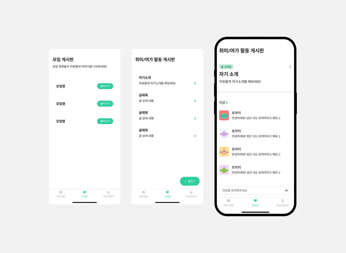또한, 네비게이션바를 통해 새로운 만남을 만들고, 게시판으로 이동할 수 있어요.