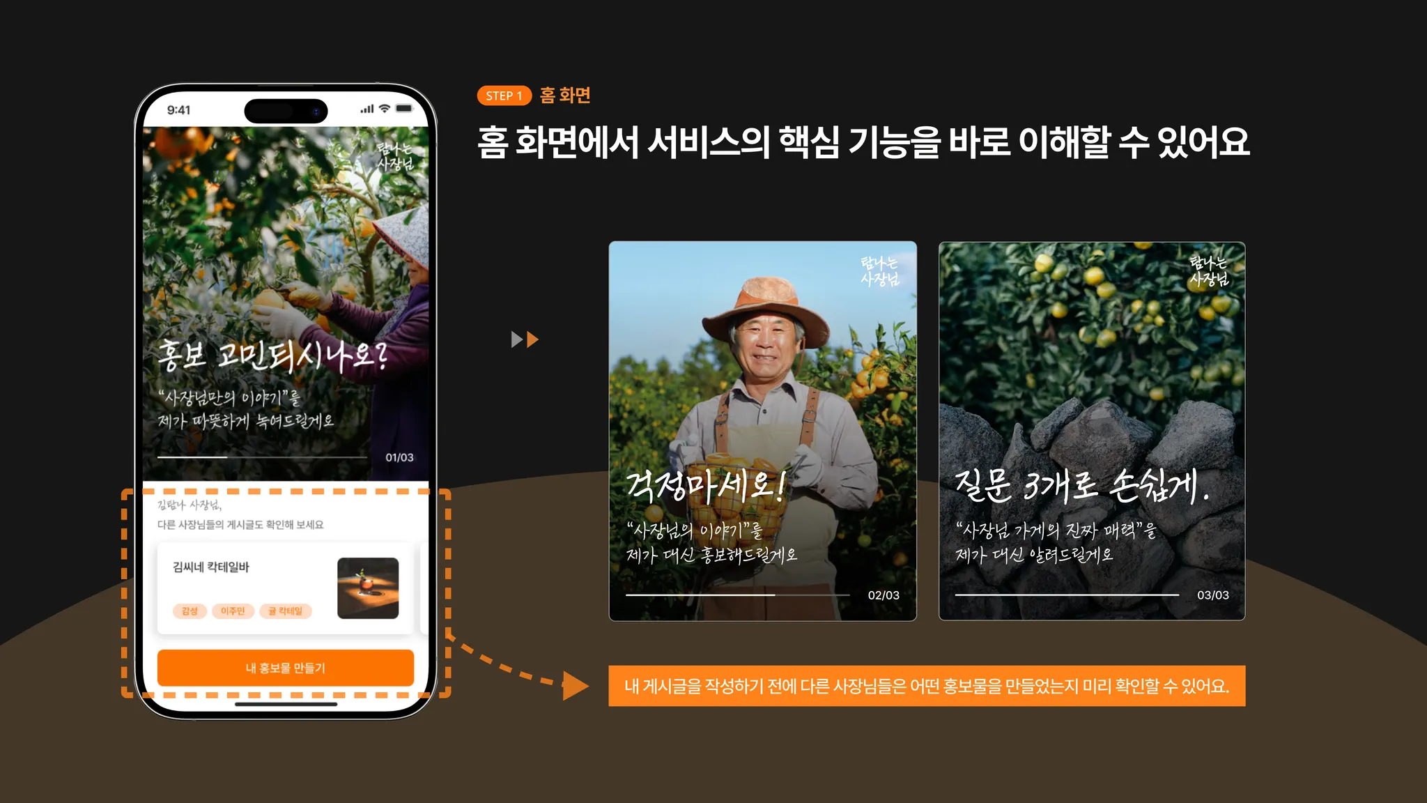 : 홈 화면에서 내 게시글을 작성하기 전에 다른 사장님들은 어떤 홍보물을 만들었는지 탐색할 수 있어요.