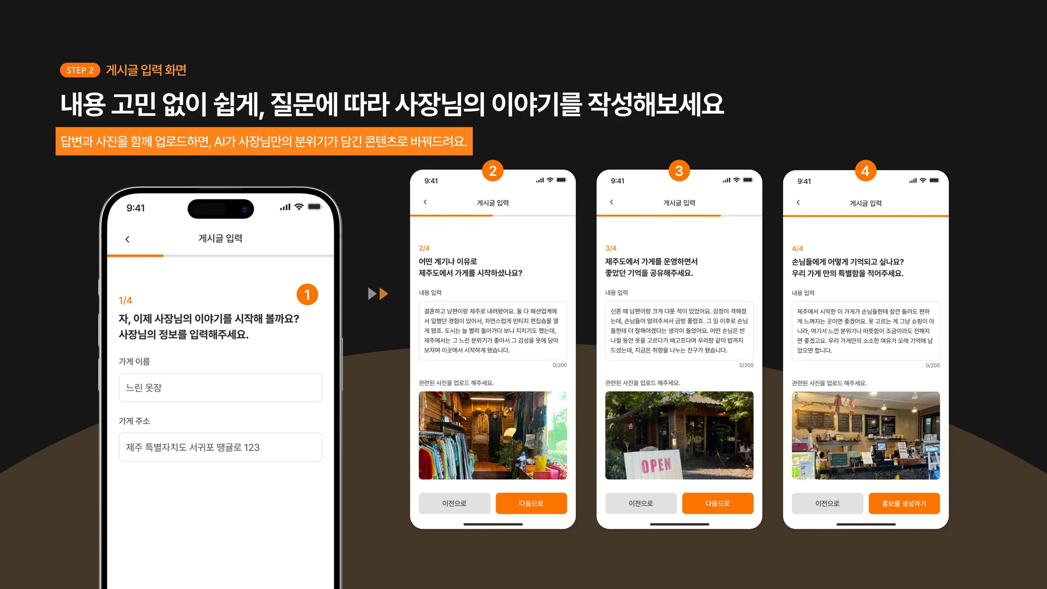 : 질문에 따라 사장님의 이야기를 작성하고, 사진과 함께 첨부하면 AI가 콘텐츠를 생성해줘요.
