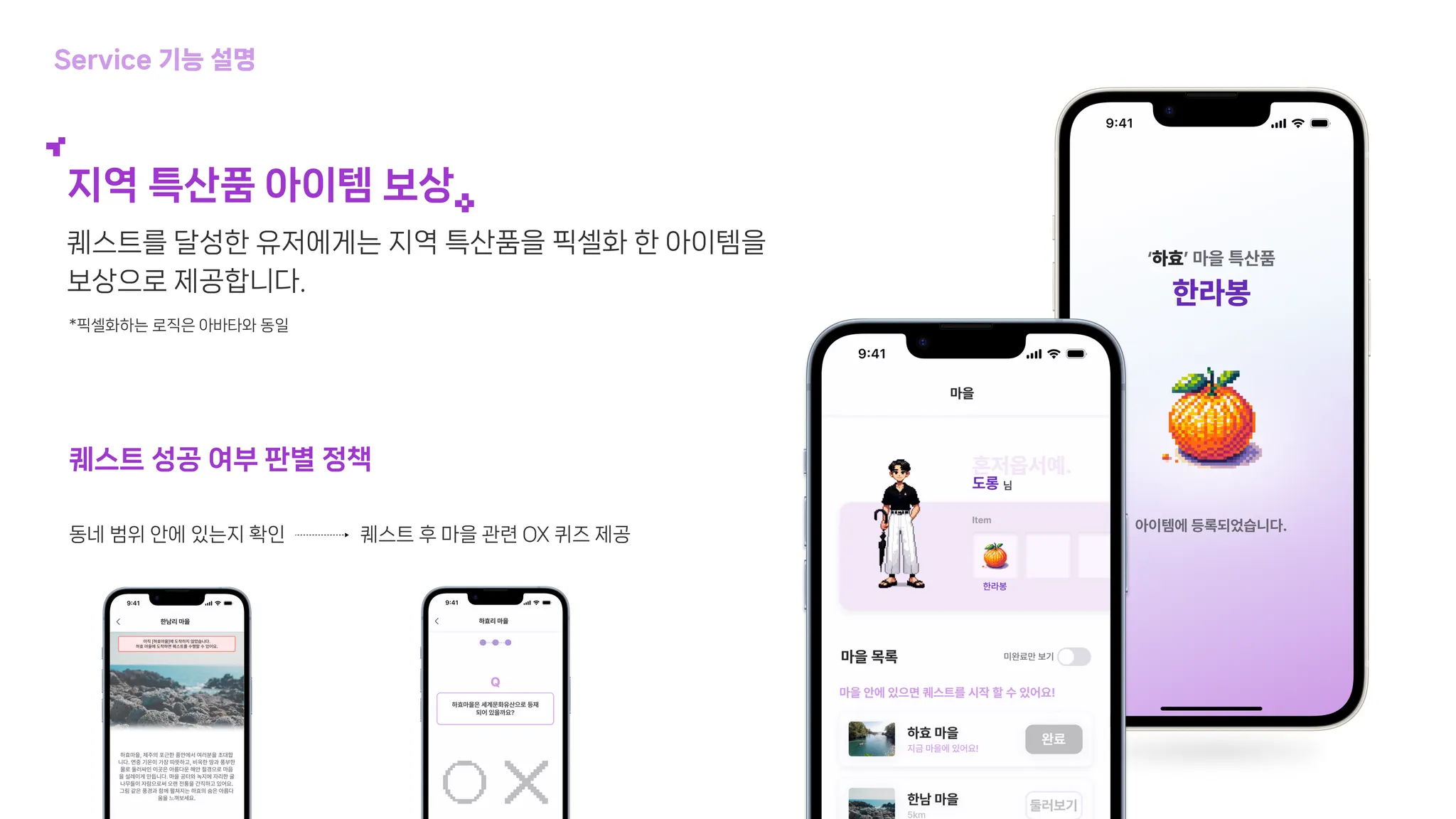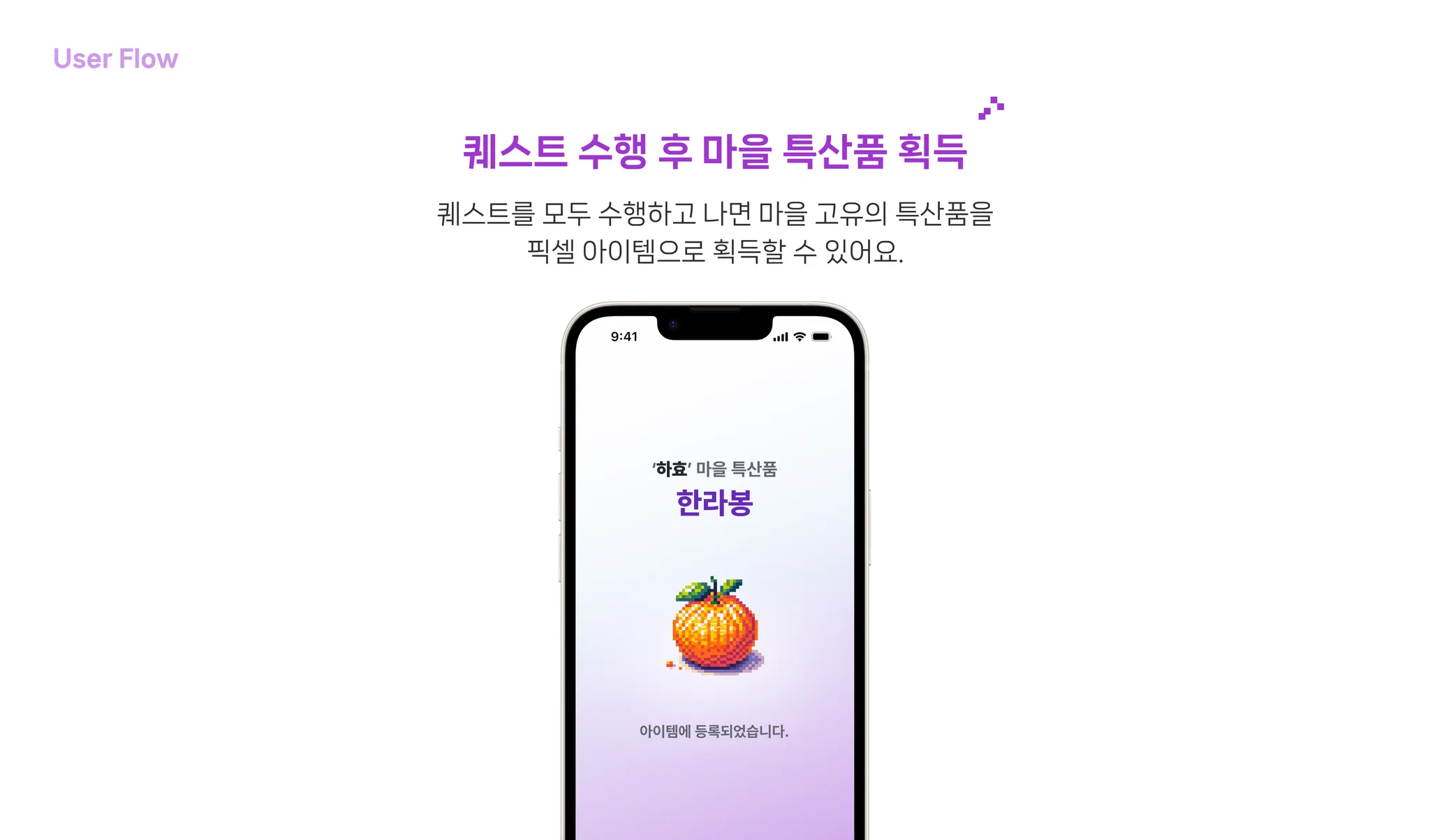 퀘스트를 달성한 유저에게는 지역 특산품을 픽셀화 한 아이템을 보상으로 제공해요.