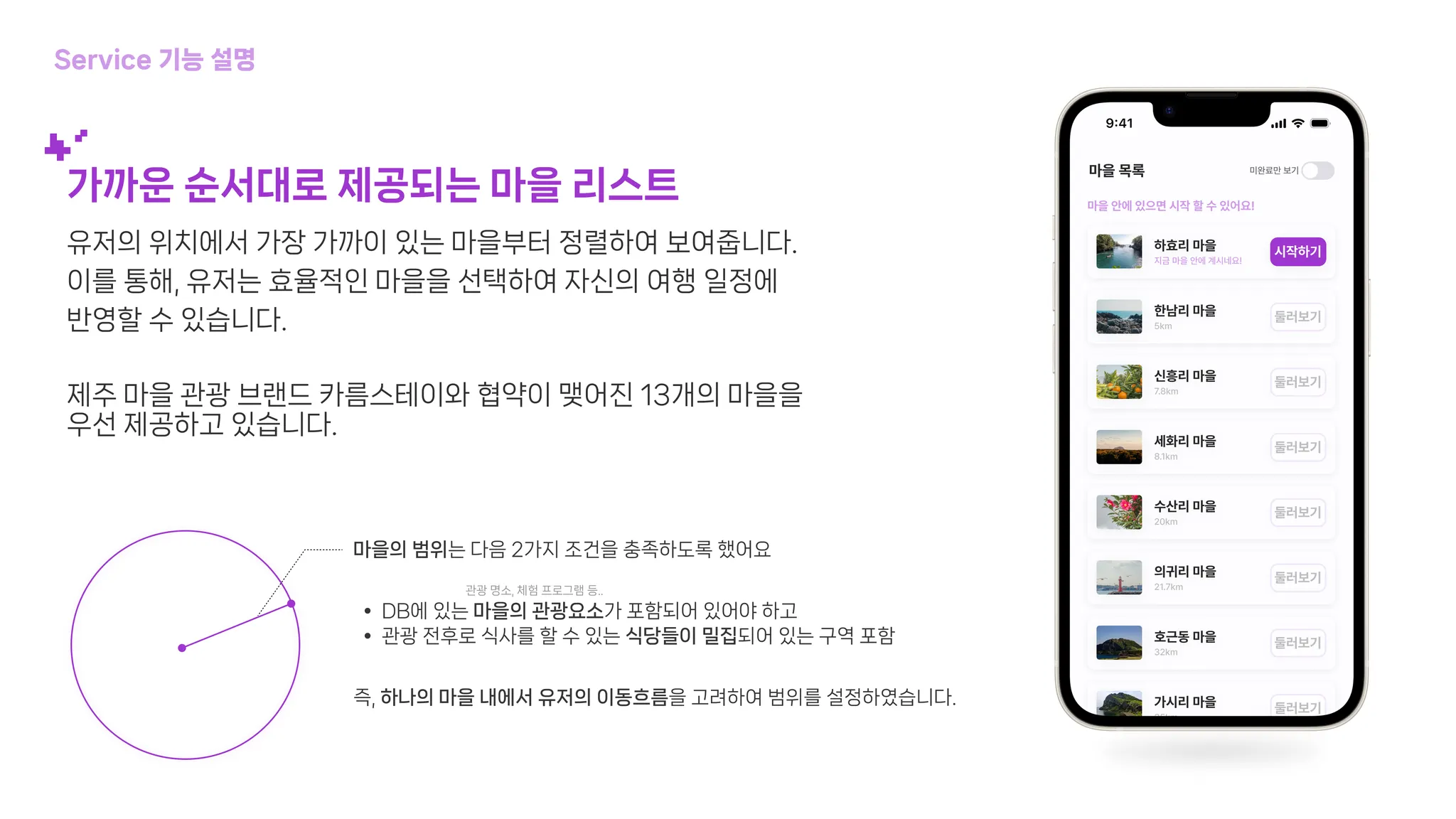 유저의 이동 흐름에 따라 설정한 마을 범위를 기준으로 마을 리스트가 가까운 순서대로 제공돼요.
