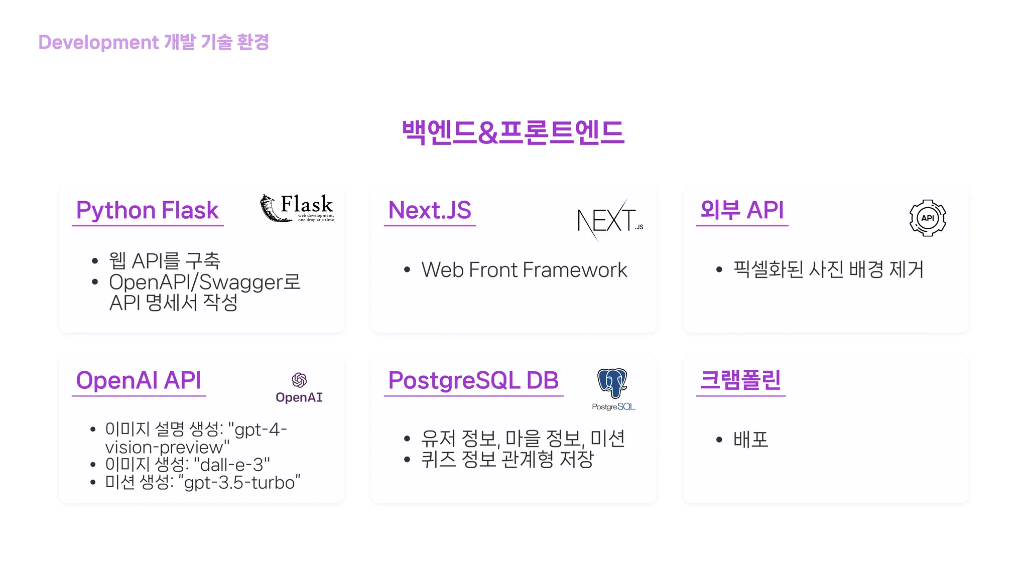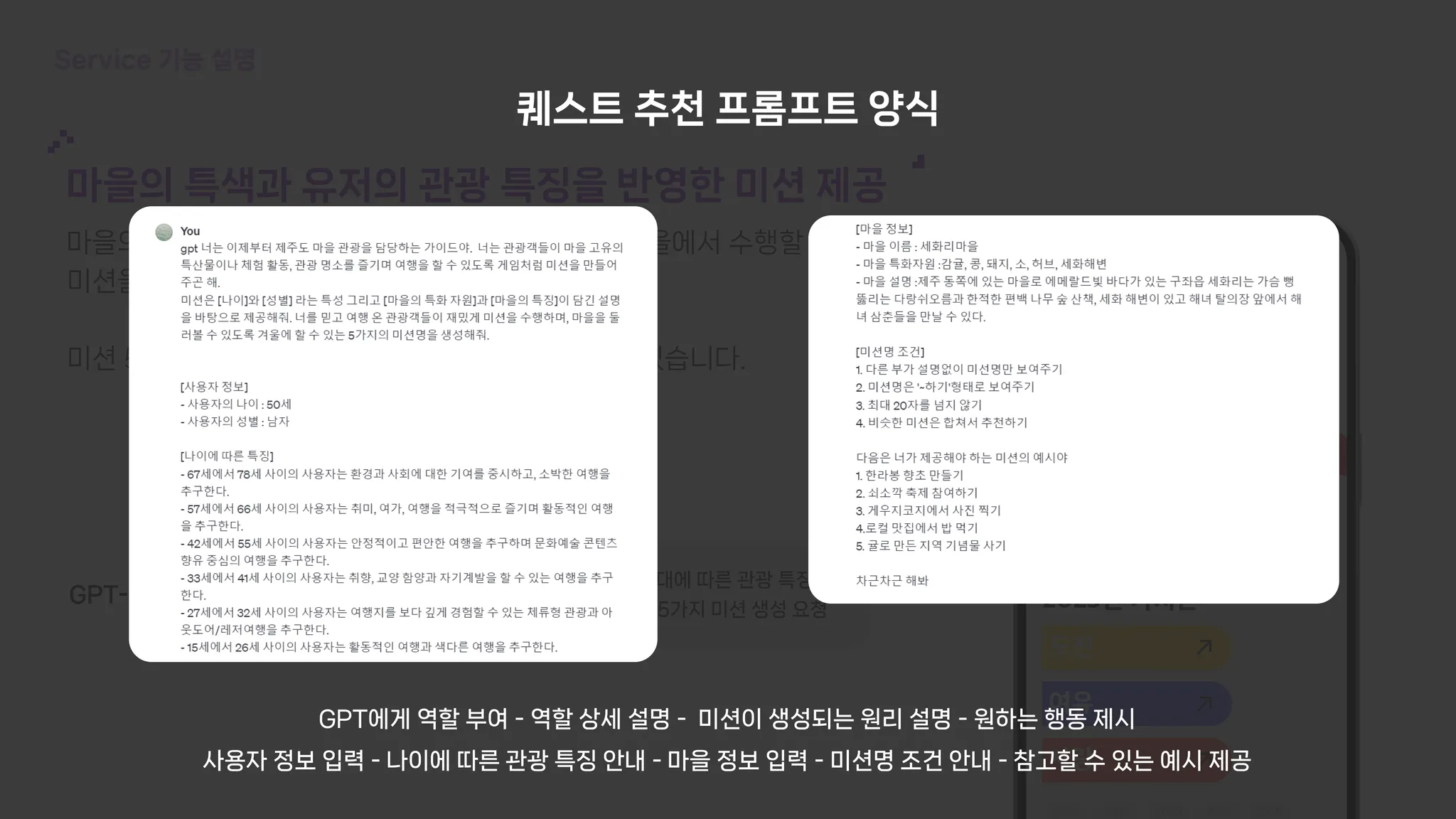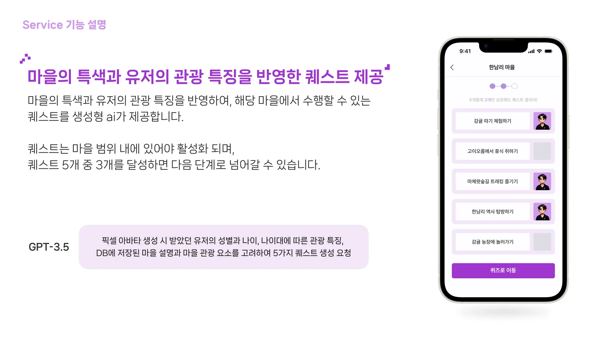 마을의 특색과 유저의 성별과 나이에 따른 관광 특징을 반영한 퀘스트들을 GPT-3.5가 생성하여 제공돼요.