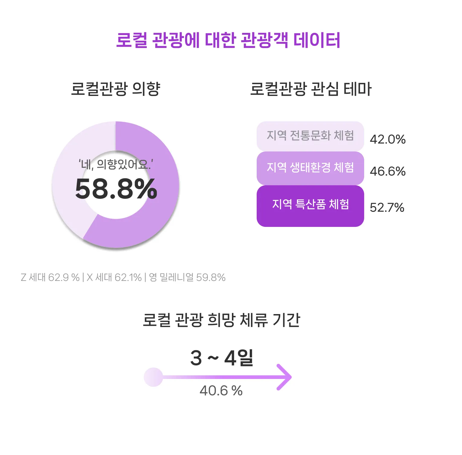 실제로 [2023 관광트렌드 전망 및 분석 보고서]에 따르면, 로컬 관광 희망 체류 기간은 3-4일로 단기간 체류 희망자가 더 많다는 것을 발견할 수 있어요.