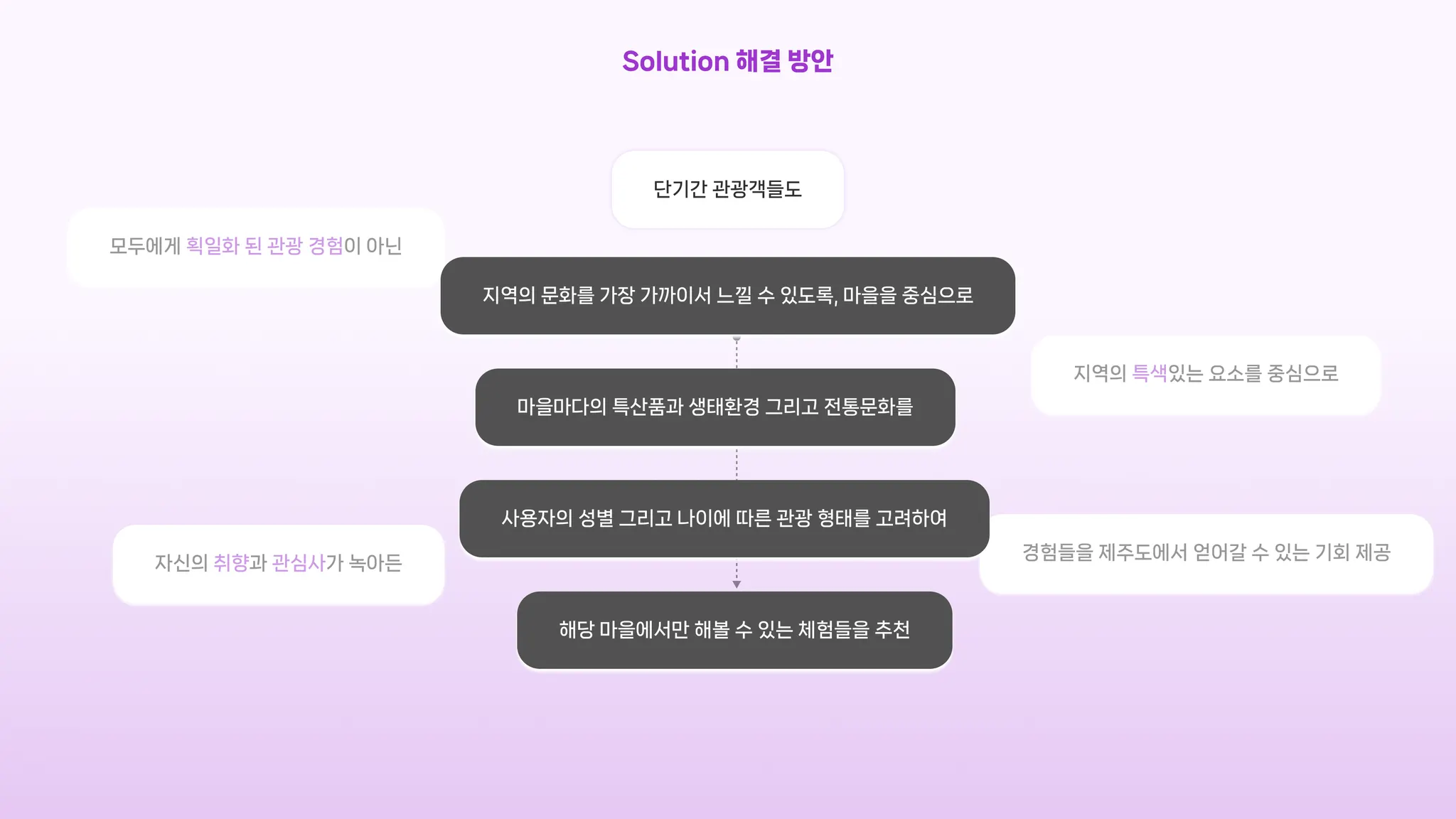 제주도 각 마을의 특성과 개인의 관광 특징을 고려한 맞춤형 퀘스트를 통해 ‘개인화’되고 ‘제주의 색깔이 확실한’ 관광 경험을 제공해요.