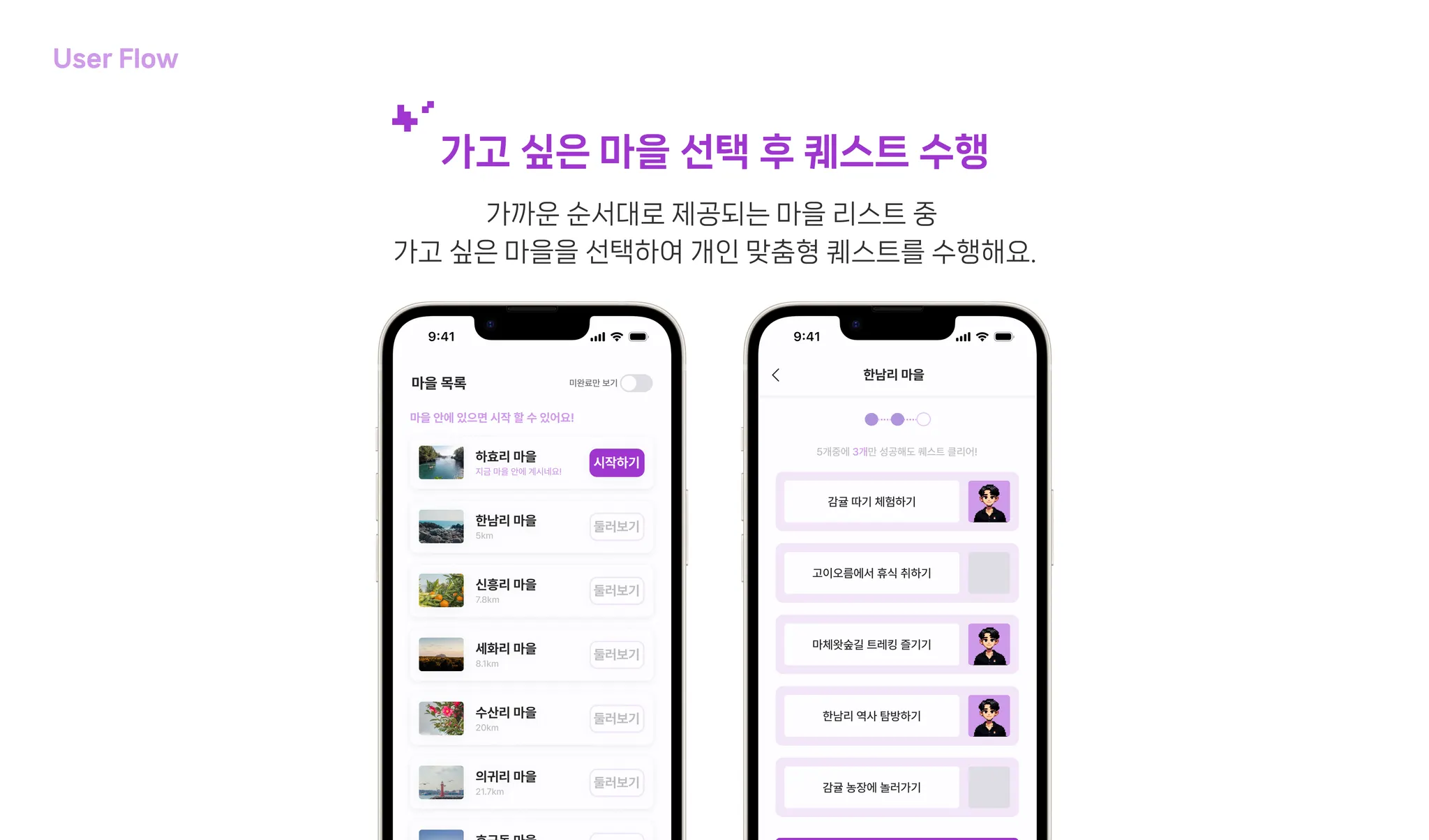 마을에서 ‘체험’할 수 있는 퀘스트를 바탕으로 지역 내에서 적극적으로 교류하고 소비를 이끌어낼 수 있어요.