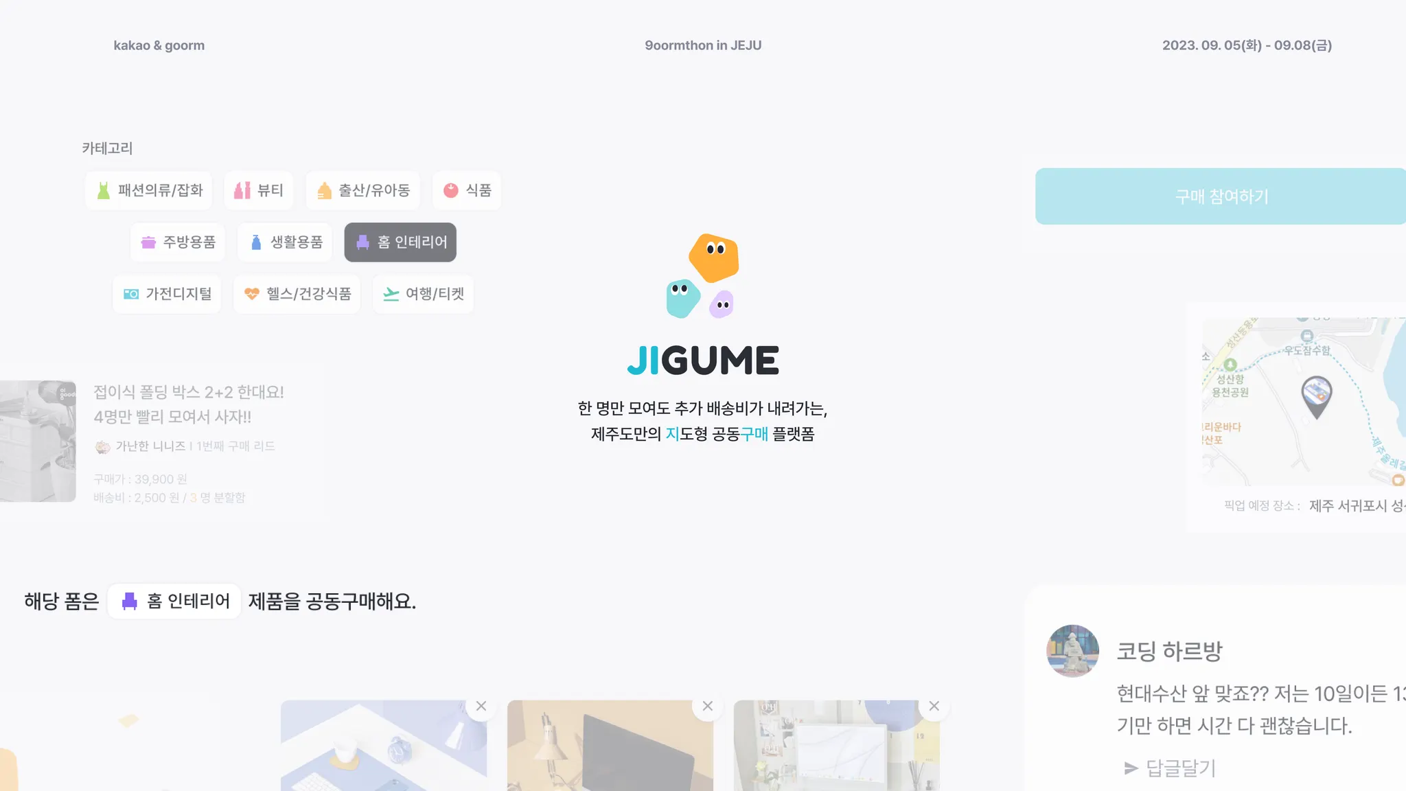 "카카오 지도 API"를 활용한 서비스로 내 위치 기반의 공동 구매를 열거나 찾아갈 수 있도록 했어요.
