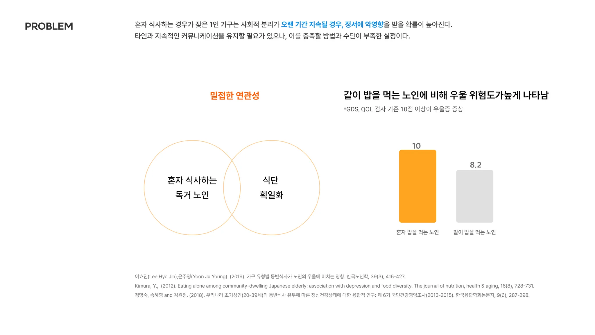 혼자 식사하는 1인 가구는 타인과 지속적인 커뮤니케이션을 유지할 필요가 있으나, 이를 충족할 방법과 수단이 부족한 실정입니다.