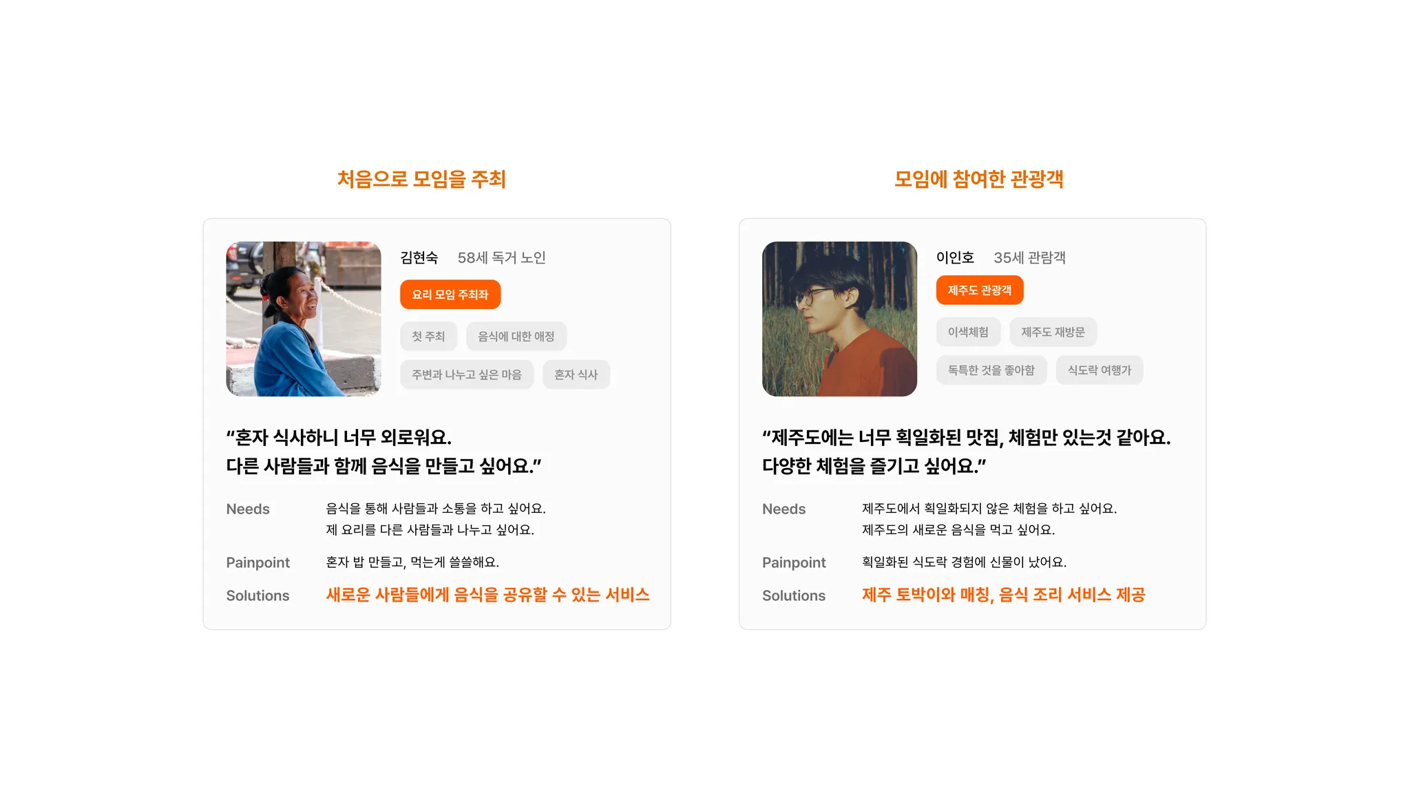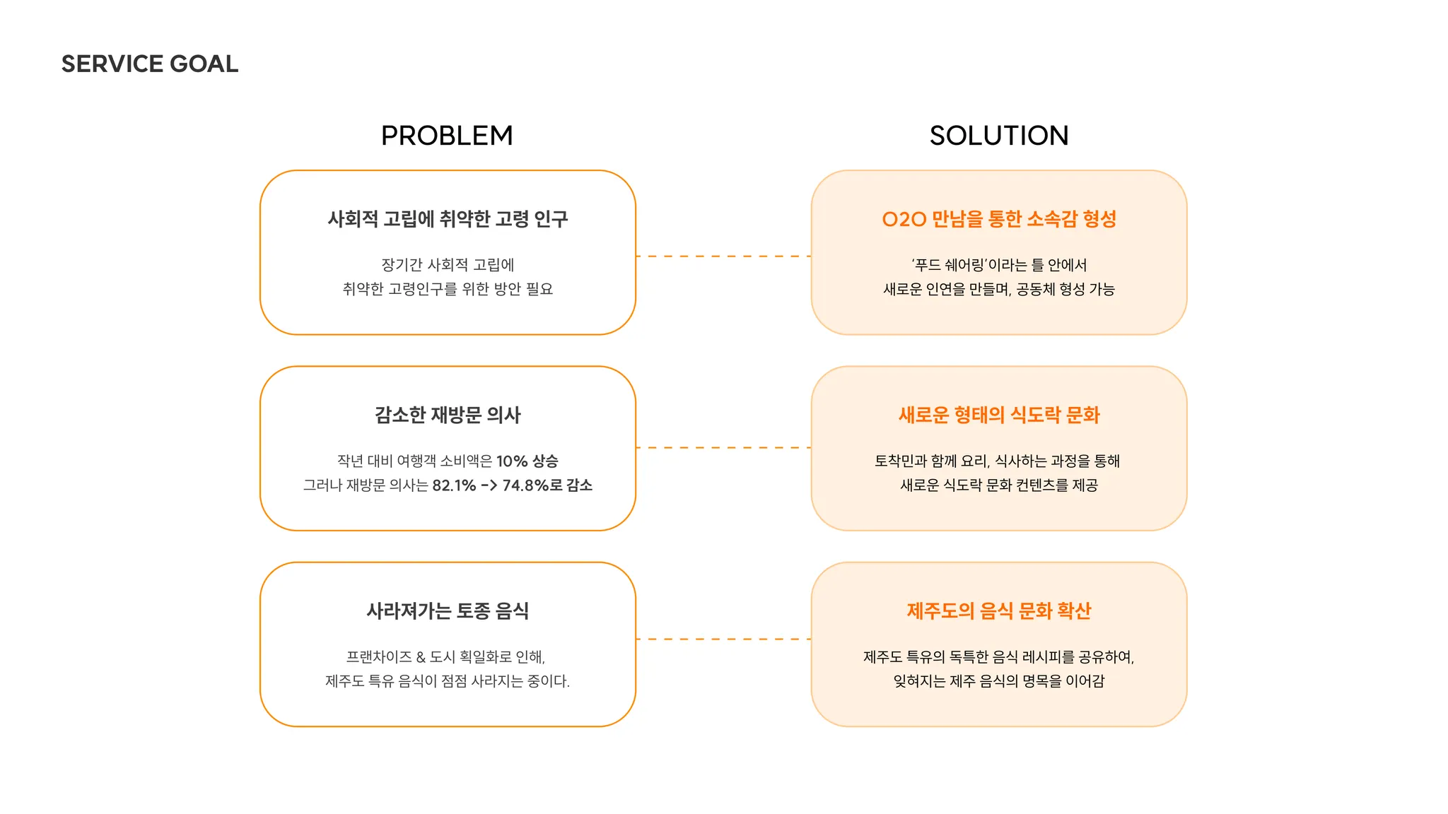 요리 모임을 통해 제주도 노인들의 ‘혼밥’로 인한 고독감 문제 와 관광객의 획일화된 콘텐츠 문제를 해결할 수 있는 아이디어를 제안하게 되었습니다.