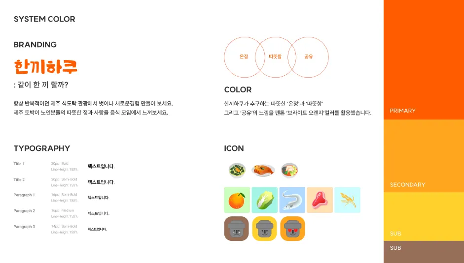 ‘브라이트 오렌지 컬러’를 활용하여 한 끼 하쿠가 추구하는 따스한 햇빛과 같은 온정을 표현했습니다.