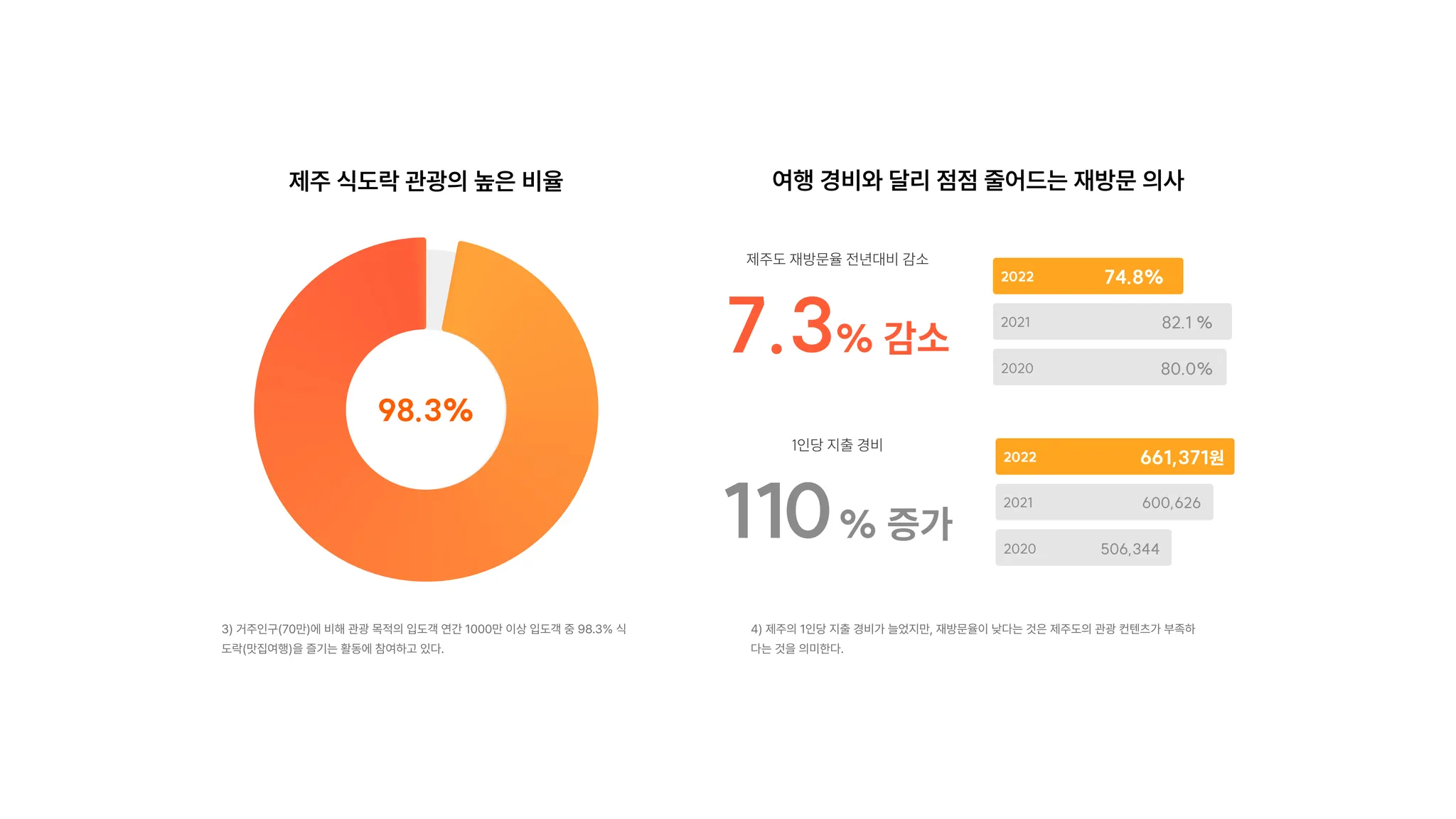하지만, 재방문률과 1인당 지출 경비가 점점 줄어들고 있는 상태로, 이는 제주도의 관광 콘텐츠가 부족하다는 이야기로 해석할 수 있습니다.