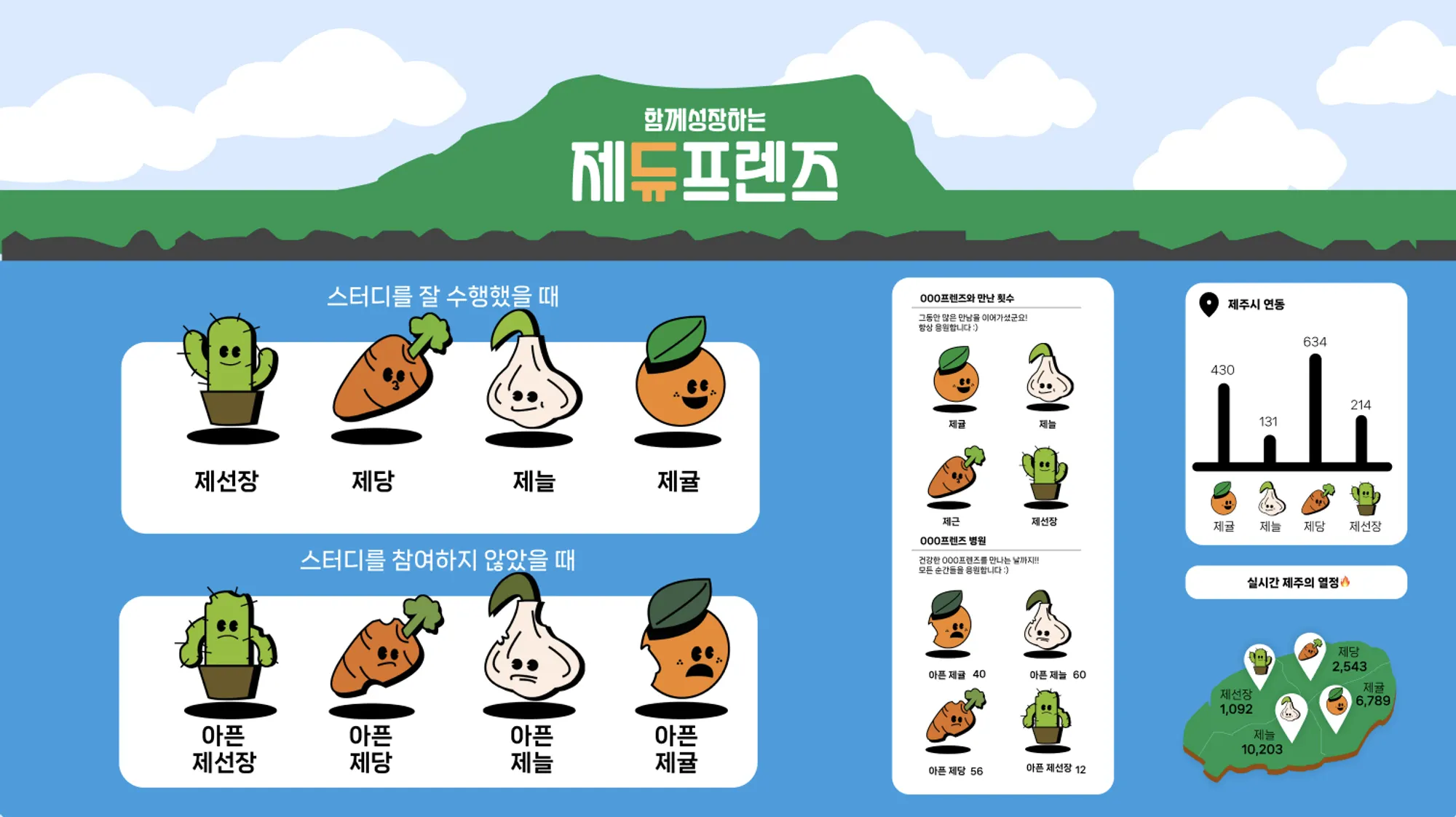 지역 특산물을 모티브로 4개의 열매 캐릭터를 만들고 각 지역과 제주도의 열정을 인포그래픽으로 표현했어요 :)