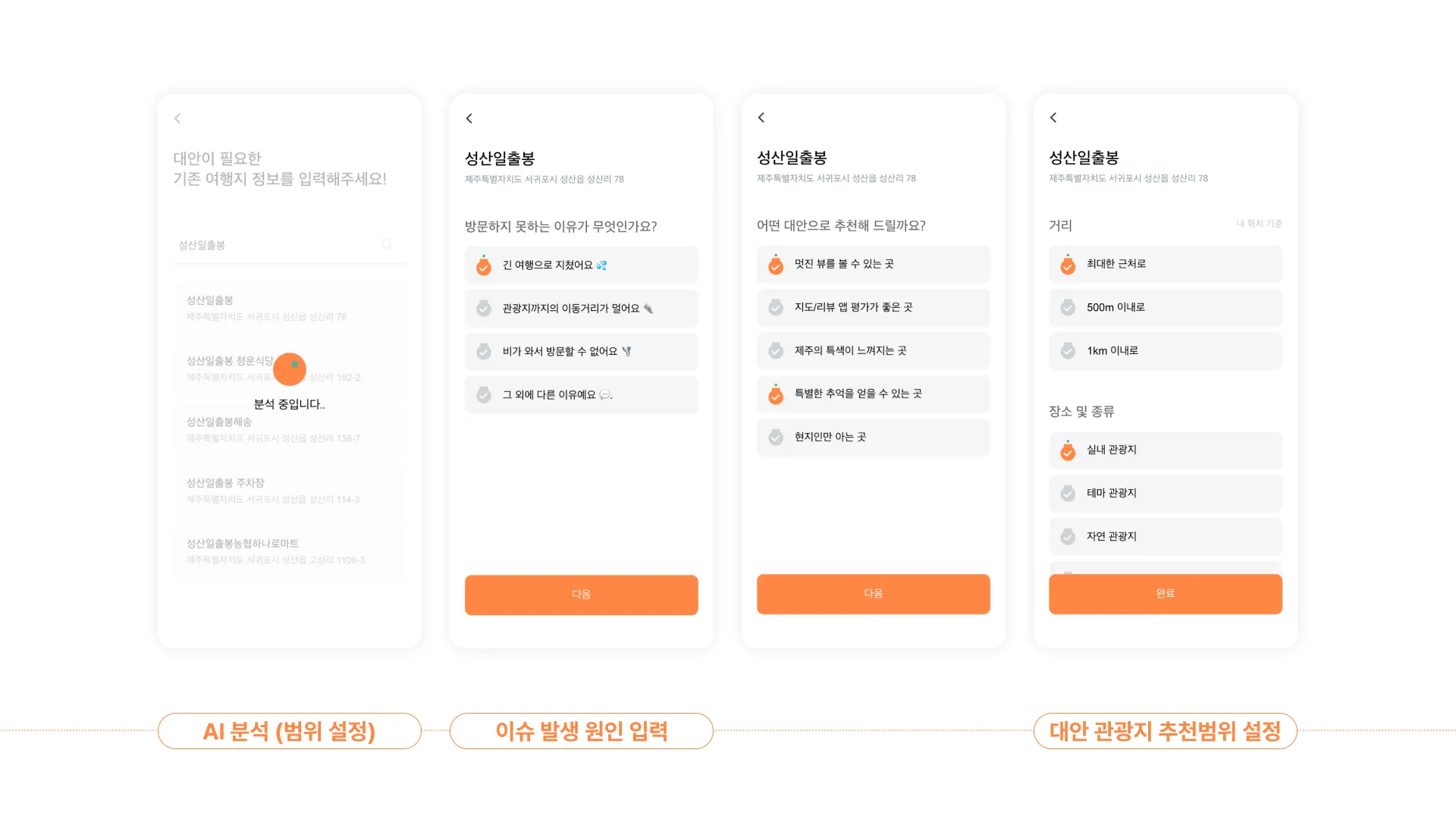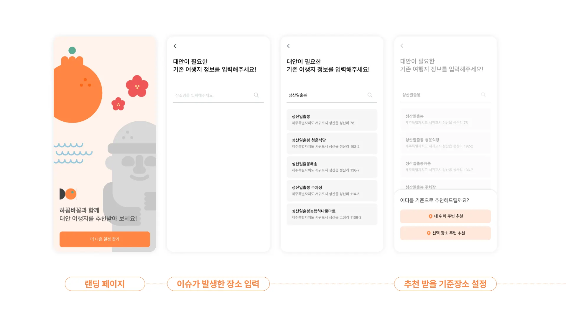 하꼼바꼼은 여행 중 이슈가 발생한 즉시, 대안 관광지를 추천받을 수 있는 유저 플로우(User Flow)를 구상했습니다.