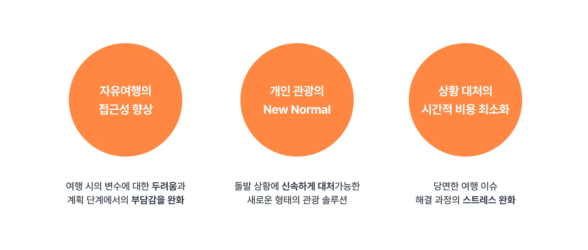 따라서 자유여행시에 완벽한 계획에 대한 강박과 부담감을 완화할 수 있습니다. 더불어, 신속하게 대처 가능한 하꼼바꼼 덕분에 개인 관광의 편의가 크게 상승하는 New Normal을 형성할 수 있습니다. 결과적으로 개인 관광객이 갑작스러운 상황에 대처할 수 있는 최적의 관광 대안 서비스로서, 당면한 관광 이슈를 해결하는 과정의 스트레스를 최소화하고 어떤 상황에서든 여행을 원활하게 이어갈 수 있습니다.