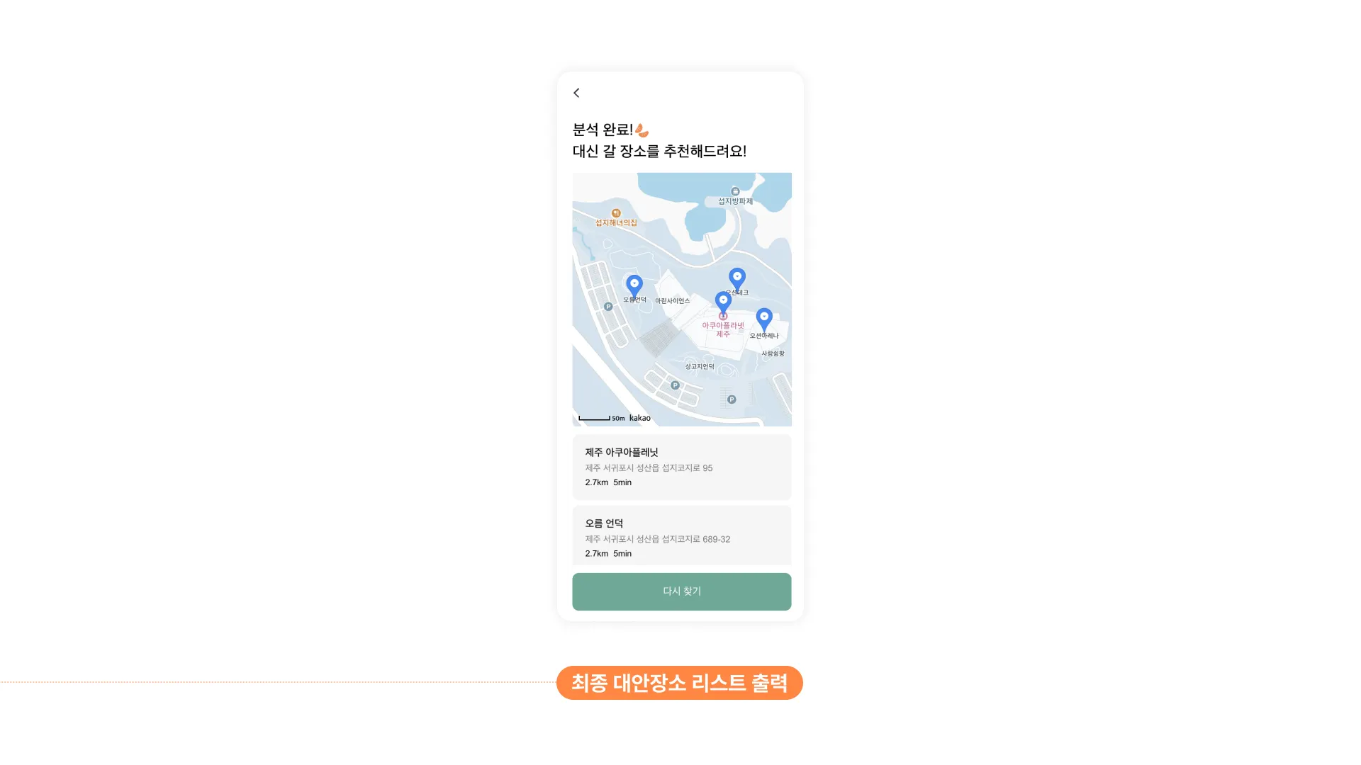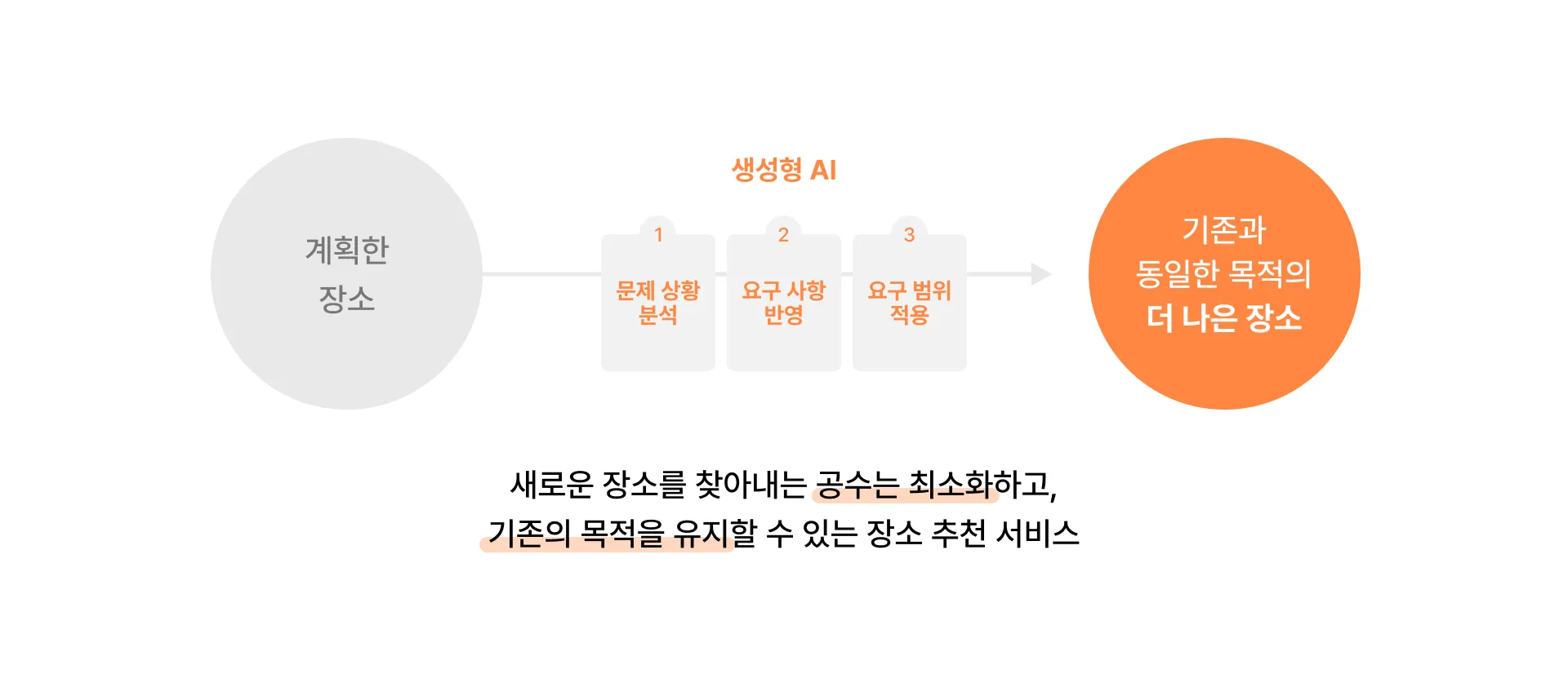 유저의 답변 속 함의된 요구사항을 분석하여 작성된 프롬프트를 기반으로 새로운 대안 장소를 도출합니다