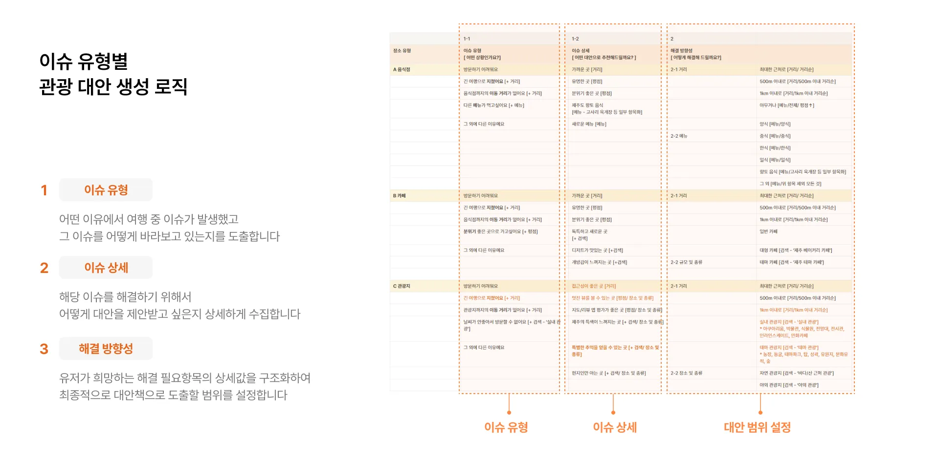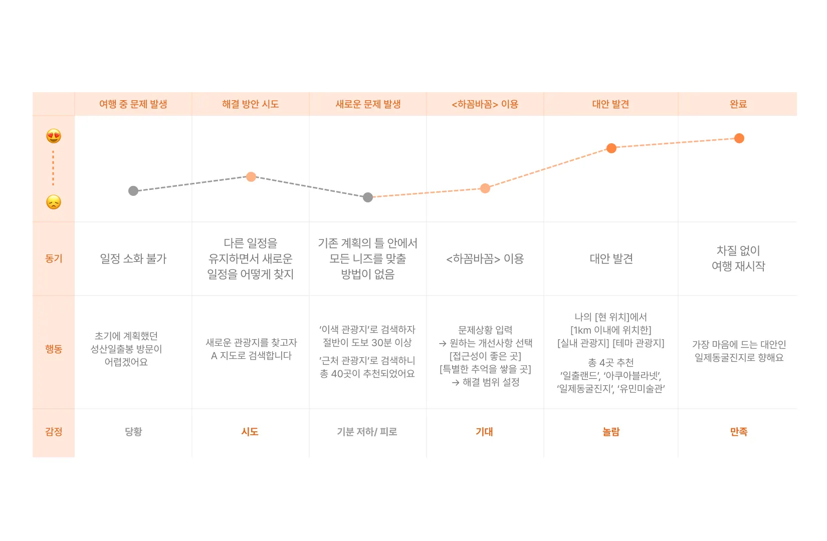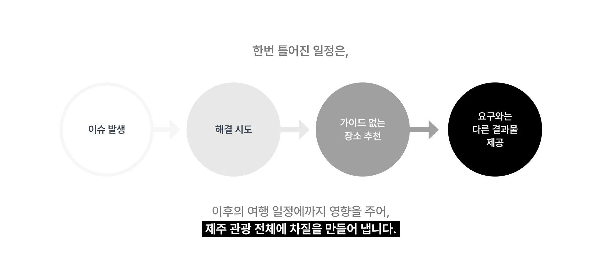 이슈가 발생한 순간, 적절한 가이드 없이 새로운 방문지를 그저 서치하다보면 결국 요구와는 다른 결과물을 추천받을 수밖에 없습니다. 다시 새로운 키워드를 입력하고, 다른 서비스를 오가며 검색하며 쌓인 피로는 여행 전반에 차질을 만들어낼 수 밖에 없습니다.