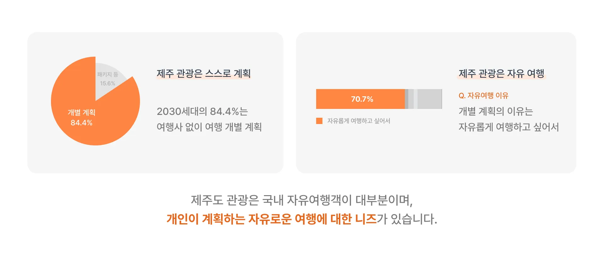 2030세대가 제주 여행시에 패키지를 선택하지 않는 이유는 개별적으로 계획하기 위해서 입니다. 단체로 원하지 않는 관광을 강행하기보다, 스스로의 취향을 여행에 반영하기 위한 것으로 보여집니다.