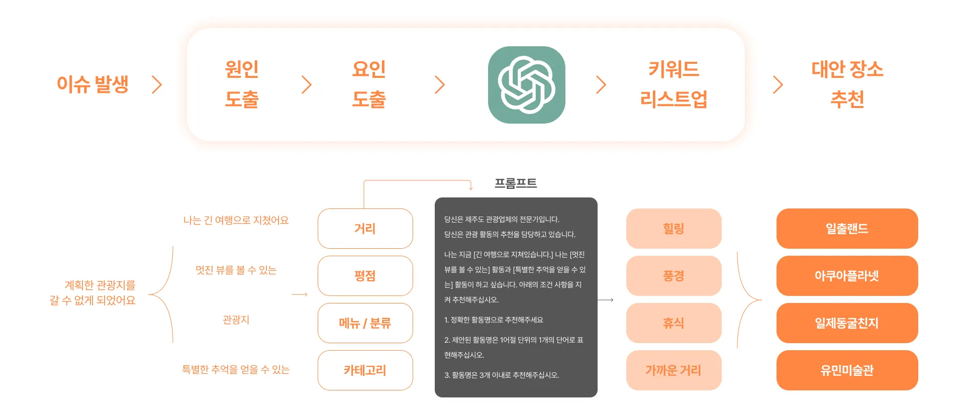 관광 계획이 갑작스럽게 틀어지더라도, 초기에 목표한 관광의 목적을 달성할 수 있다면 불편함 없이 여행을 지속할 수 있지 않을까요? 생성형 AI를 활용하여 나의 문제 상황을 분석하고, 요구사항을 반영하며, 이를 적용할 범위만을 설정한다면 나의 관광 목적에 부합하는 최적화된 대안 도출이 가능합니다.