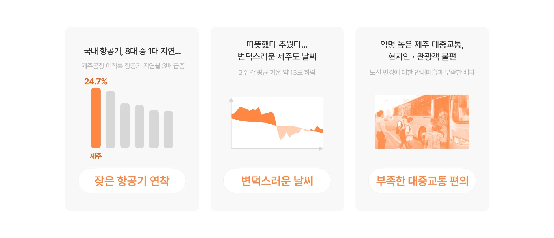 제주로 향하는 국내 항공기는 높은 확률로 연착되기 때문에 정시성이 불명확합니다. 날씨도 변덕스러운데요, 2주간 평균 13도가 하락하기도 하는 제주 날씨는 야외활동시에 다양한 제약을 만들곤 합니다. 더불어 대중교통의 배차시간이 길고 안내가 미흡한 경우도 많아, 도착시간을 예상하기 어렵습니다.